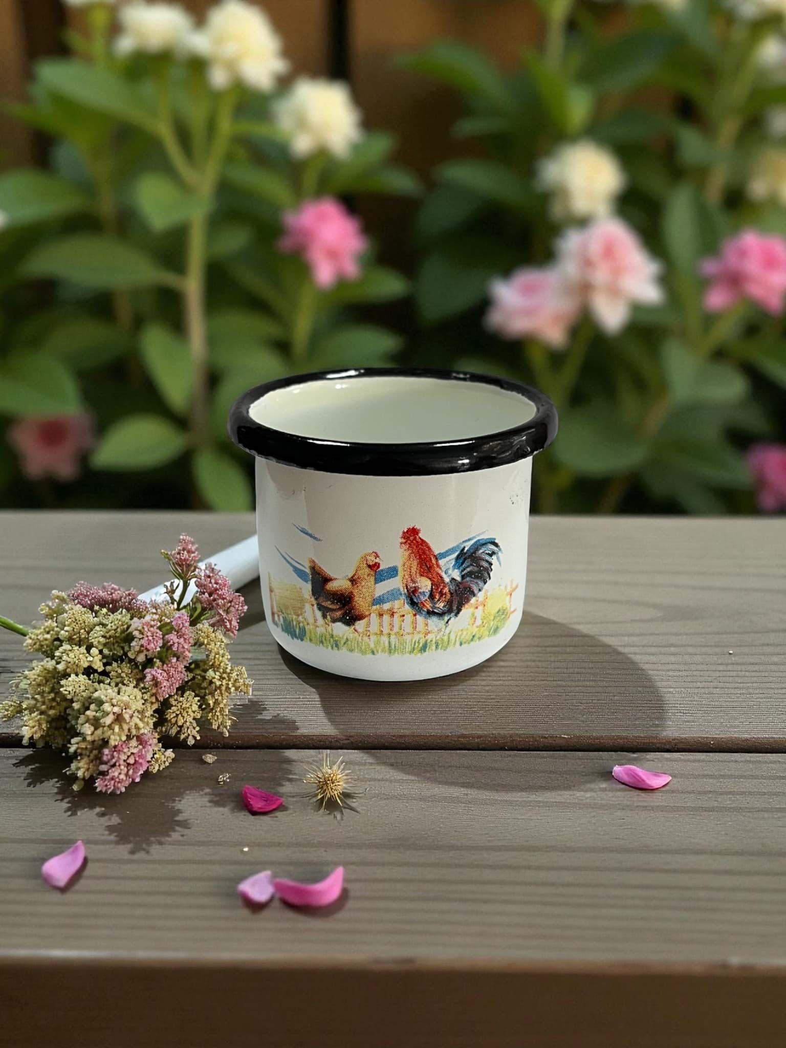 Această ceșcuță emailată pentru cafea aduce un plus de culoare și veselie oricărei dimineți. Decorată cu un cocoș vibrant, ea emană un farmec rustic, amintind de viața la țară. Emailul protector asigură durabilitate și rezistență, făcând-o ideală pentru utilizare zilnică, atât acasă, cât și în aer liber, la picnicuri sau camping. Designul cu cocoș adaugă un element distinctiv, transformând o simplă ceașcă într-o piesă decorativă aparte.