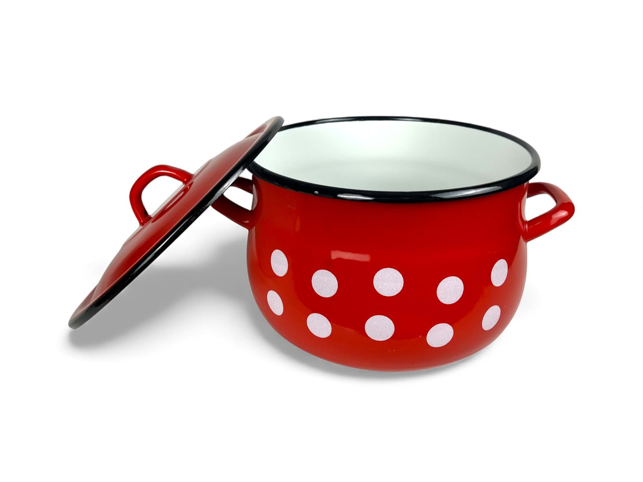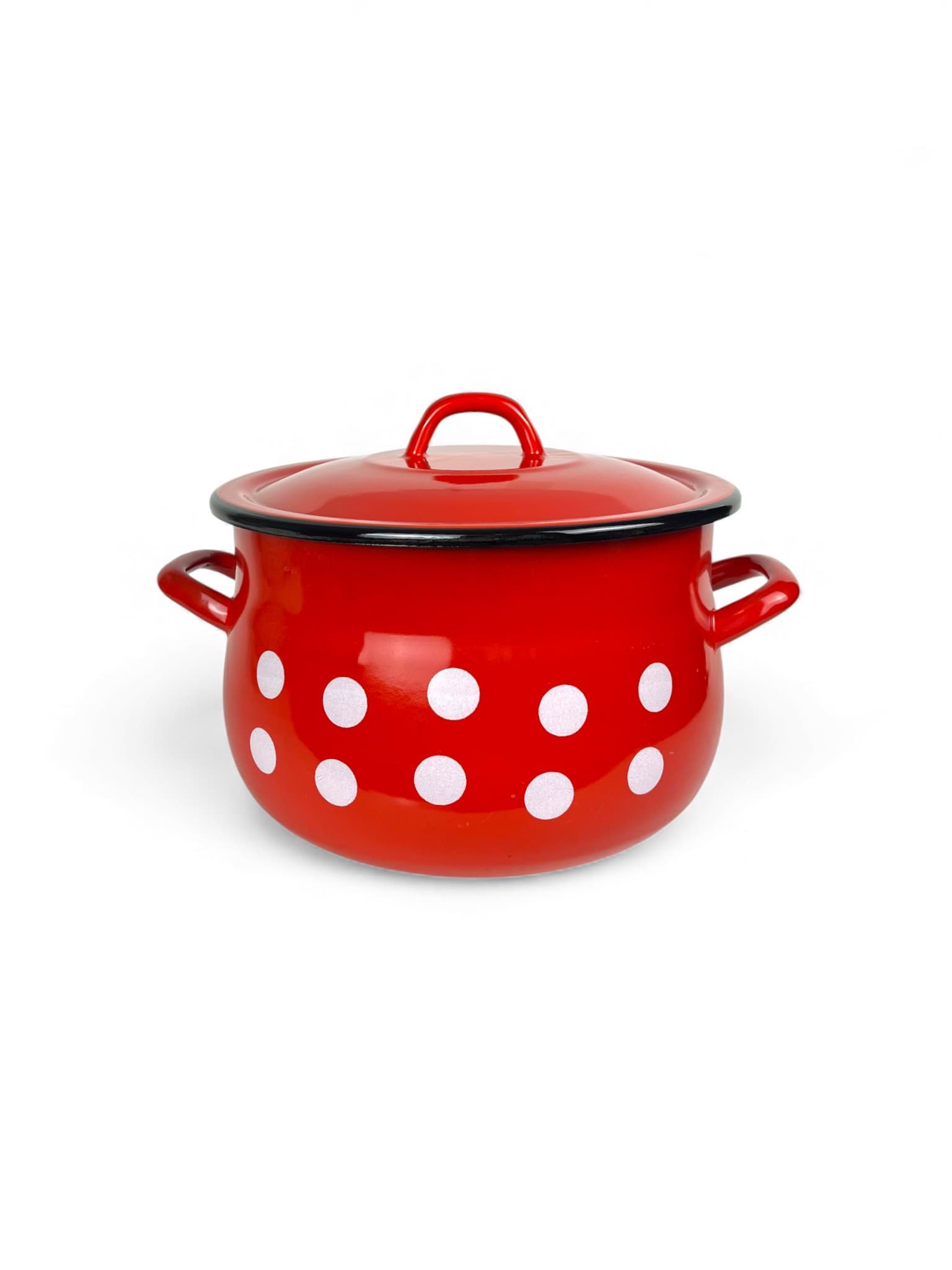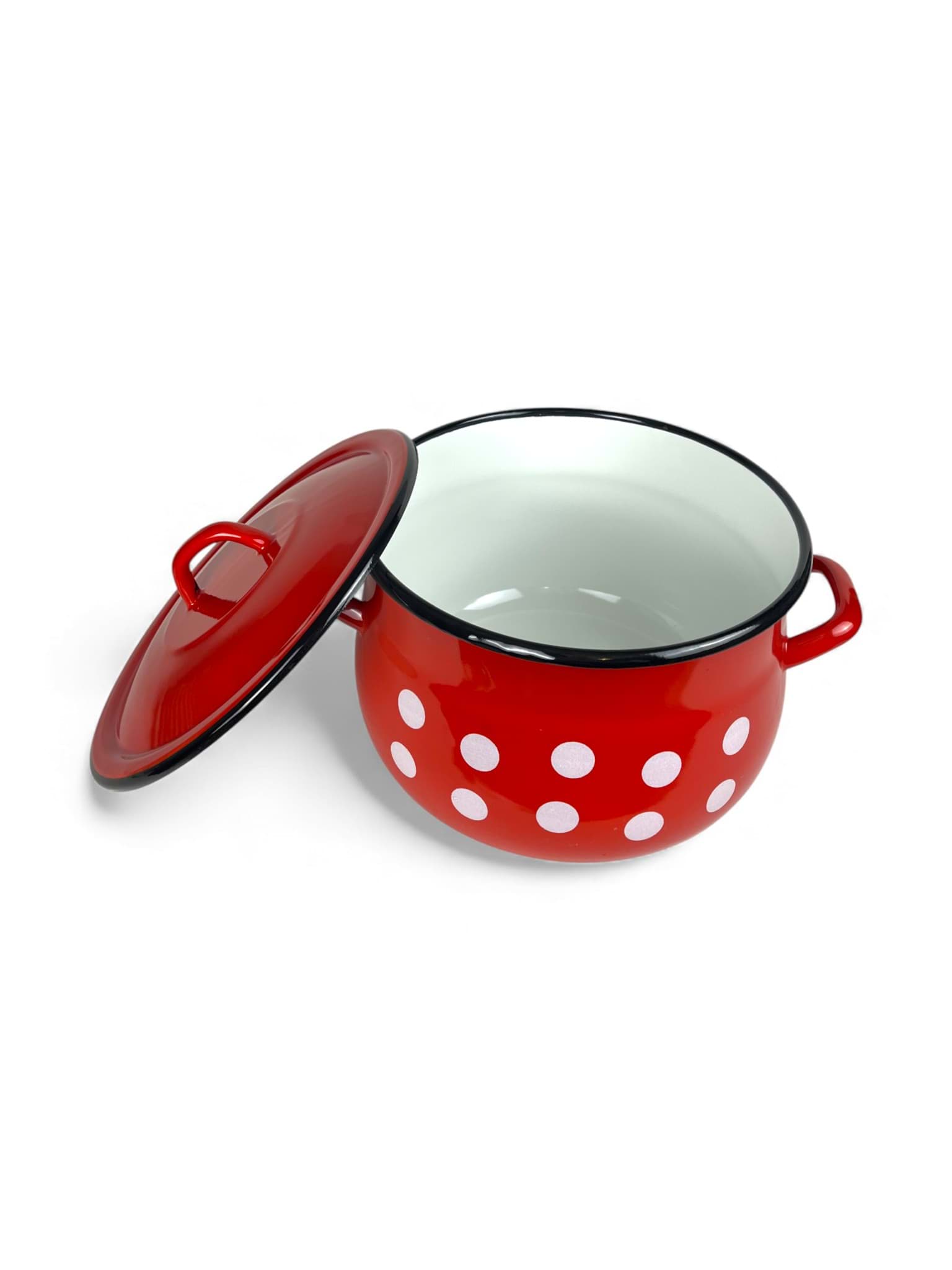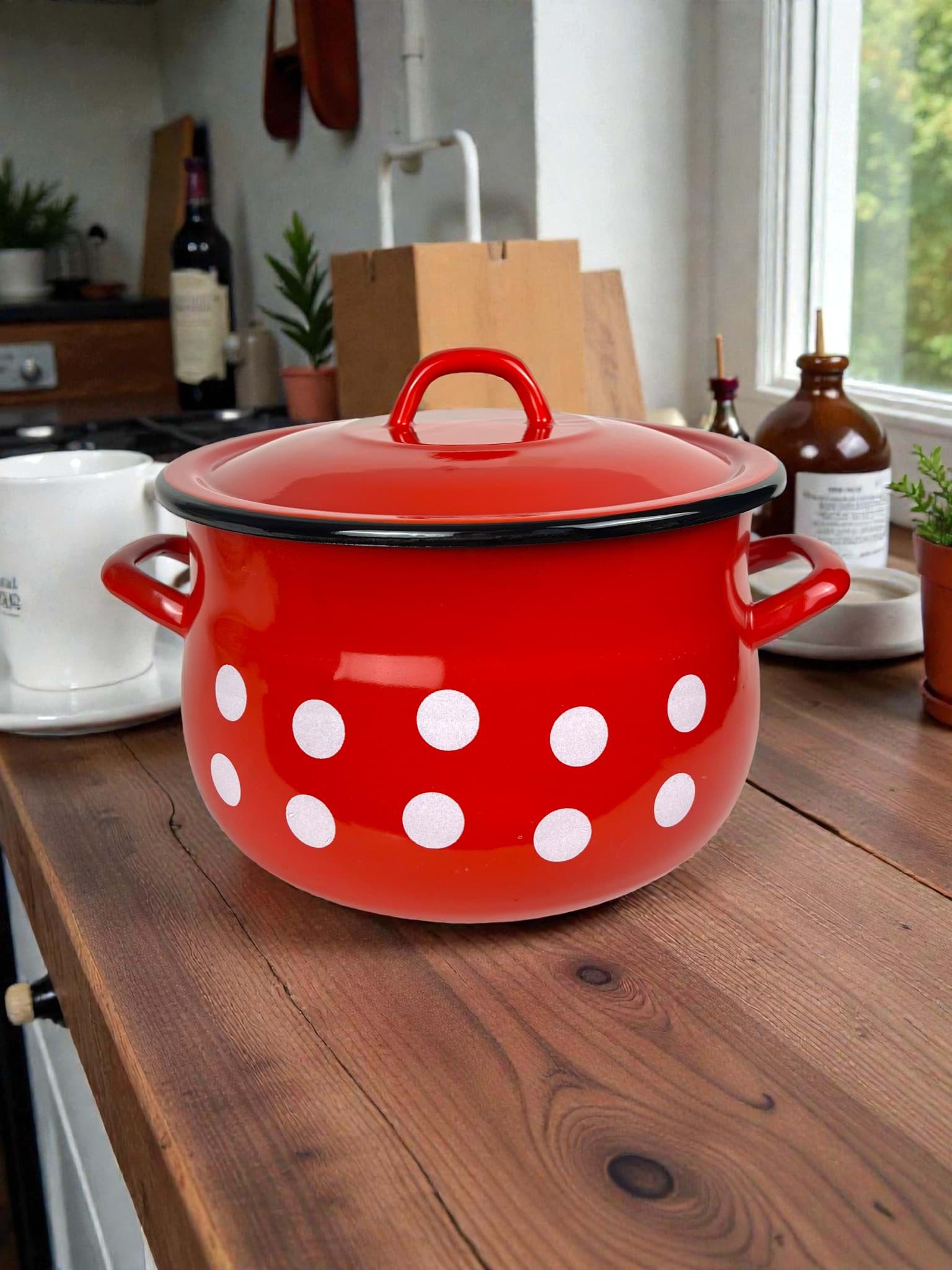 Această cratiță bombată este un element de bucătărie ce îmbină funcționalitatea cu un aspect estetic plăcut. Finisajul emailat, de un roșu vibrant cu buline albe, aduce un plus de culoare și un aer vesel în orice bucătărie. Emailul este un material rezistent la zgârieturi și ușor de curățat, asigurând o durată lungă de viață a produsului. Forma bombată a cratiței facilitează amestecarea ingredientelor și distribuirea uniformă a căldurii, fiind ideală pentru prepararea unei game variate de mâncăruri, de la sosuri delicate la tocănițe consistente. Diametrul de 24 cm o face potrivită pentru porții medii, fiind perfectă pentru o familie mică sau pentru gătit ocazional.