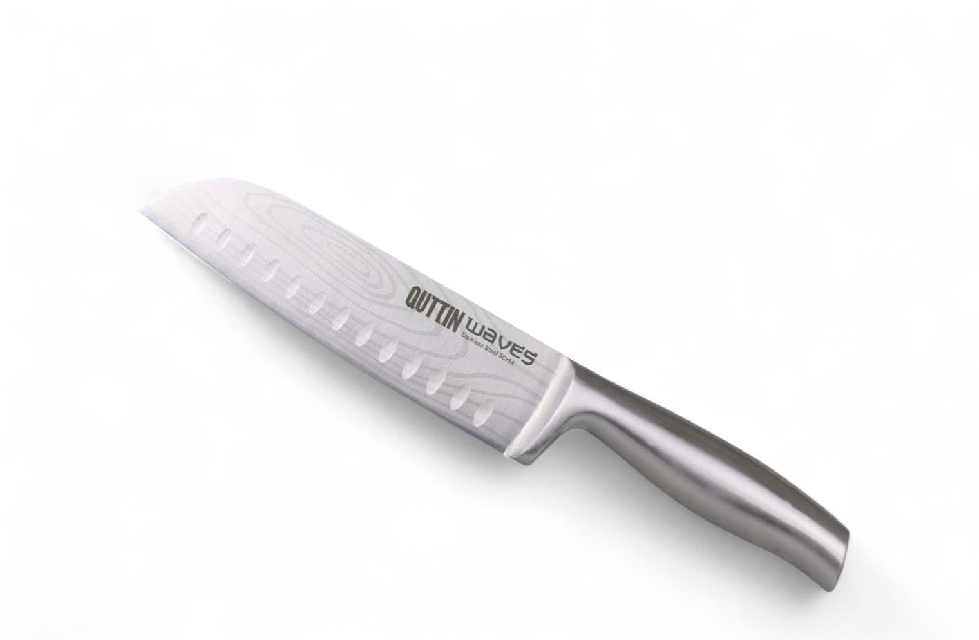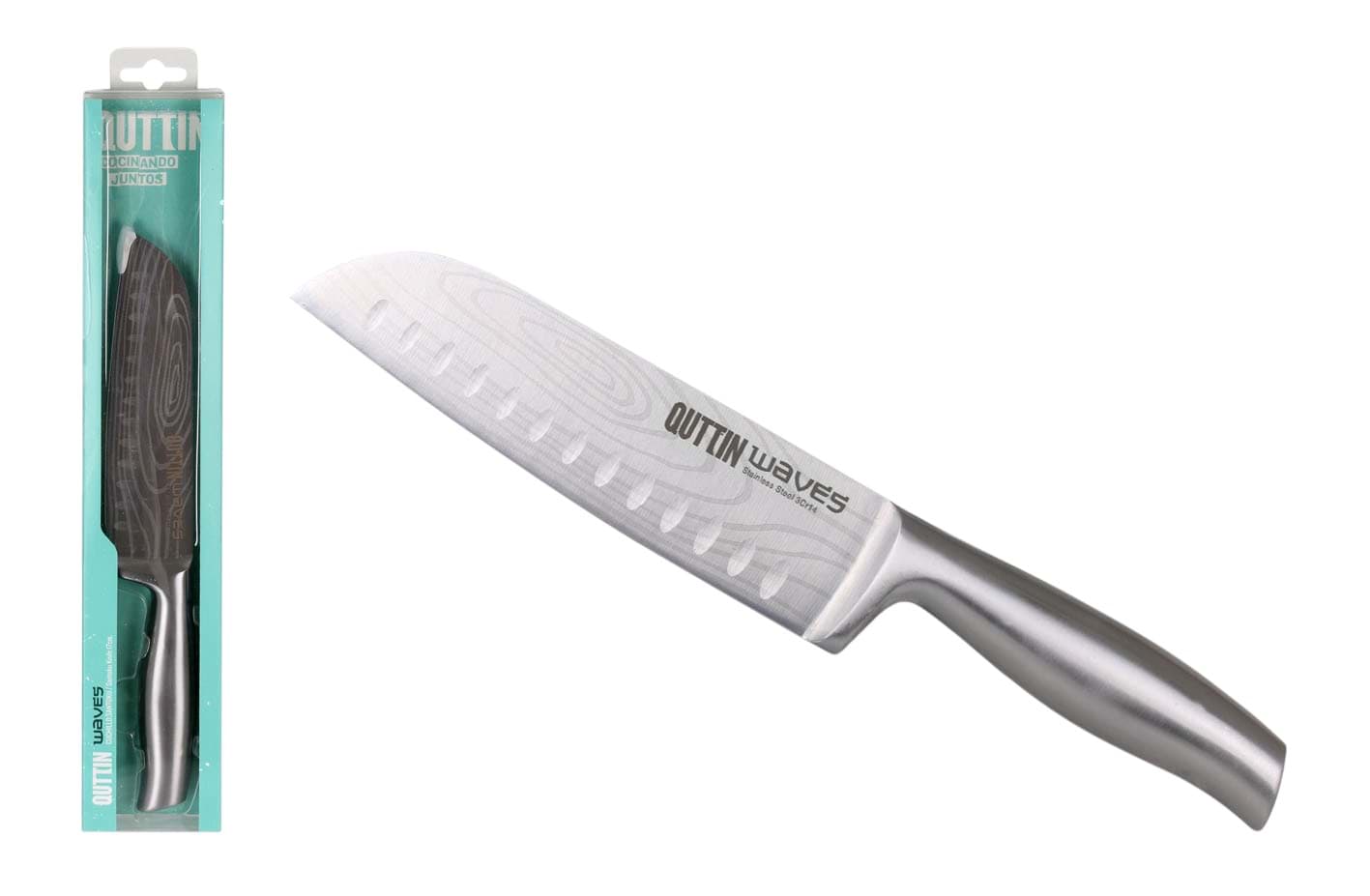Cuțitul profesional Santoku Quttin Waves de 17 cm este o unealtă esențială pentru orice bucătar, de la amatori pasionați până la profesioniști experimentați. Designul său unic, cu lamă și mâner turnate integral, oferă o echilibrare perfectă și o durabilitate remarcabilă. Lama este ideală pentru o varietate largă de sarcini, de la felierea fină a legumelor și cărnii, până la tocarea ierburilor aromatice. Modelul Waves nu doar că îmbunătățește estetica cuțitului, dar ajută și la prevenirea lipirii alimentelor de lamă în timpul utilizării.
