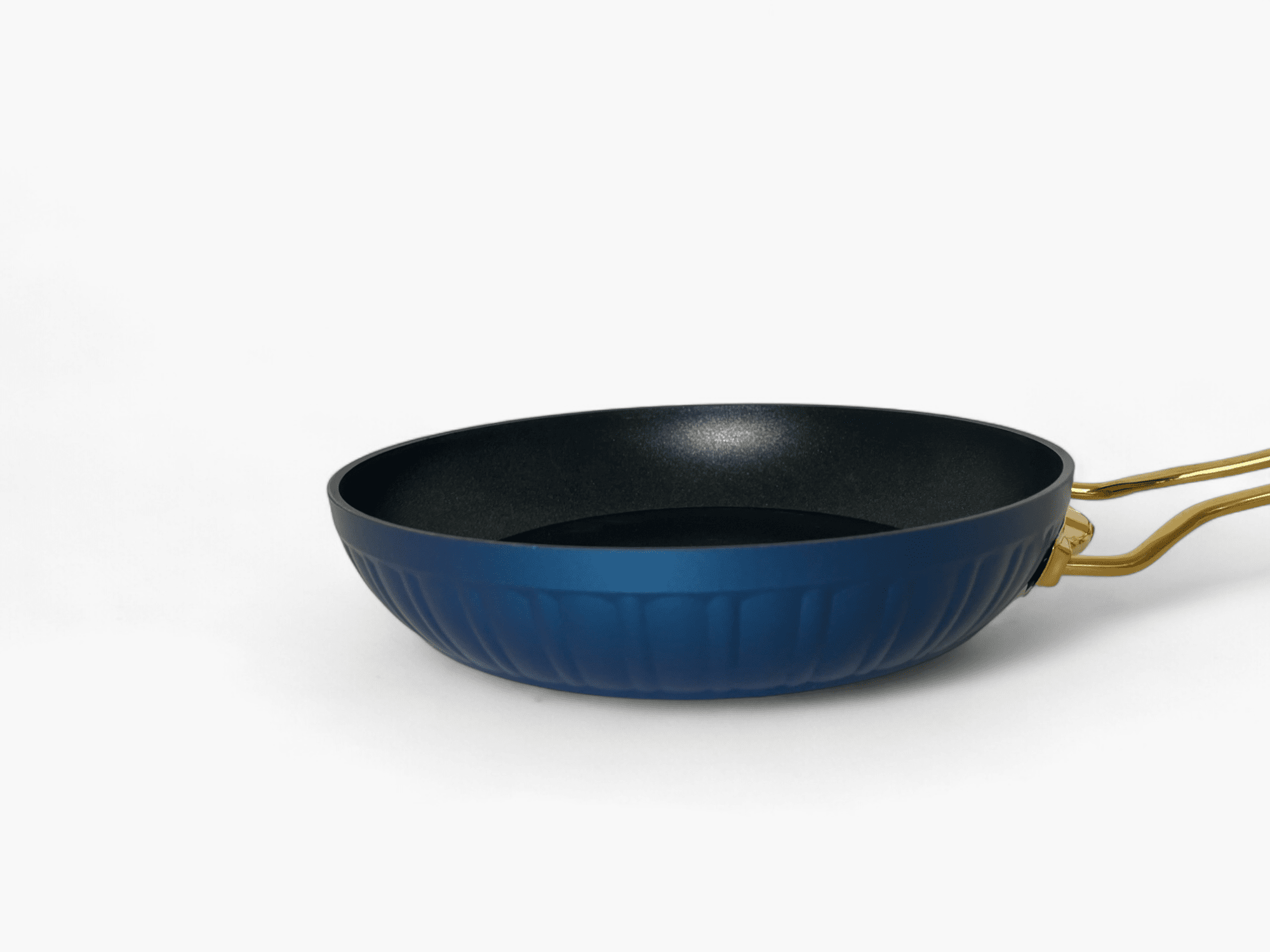 The versatile blue Kismet Elite aluminum frying pan, with a diameter of 26cm, is perfect for daily cooking. This frying pan adds a splash of color and elegance to any kitchen. The golden handle ensures a secure grip and modern design, while the non-stick interior finish allows for low-fat cooking and easy cleaning. Ideal for making fluffy omelets, juicy meats, or crispy vegetables.