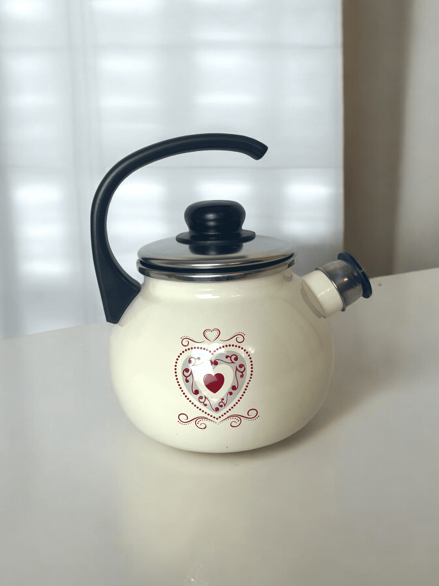 A kettle with soul! Its classic design, with delicately painted hearts, will transport you to a world of pleasant memories. The discreet whistle alerts you when the water has boiled, and the ergonomic handles ensure a comfortable grip. Perfect for enjoying a cup of tea in a relaxing atmosphere.