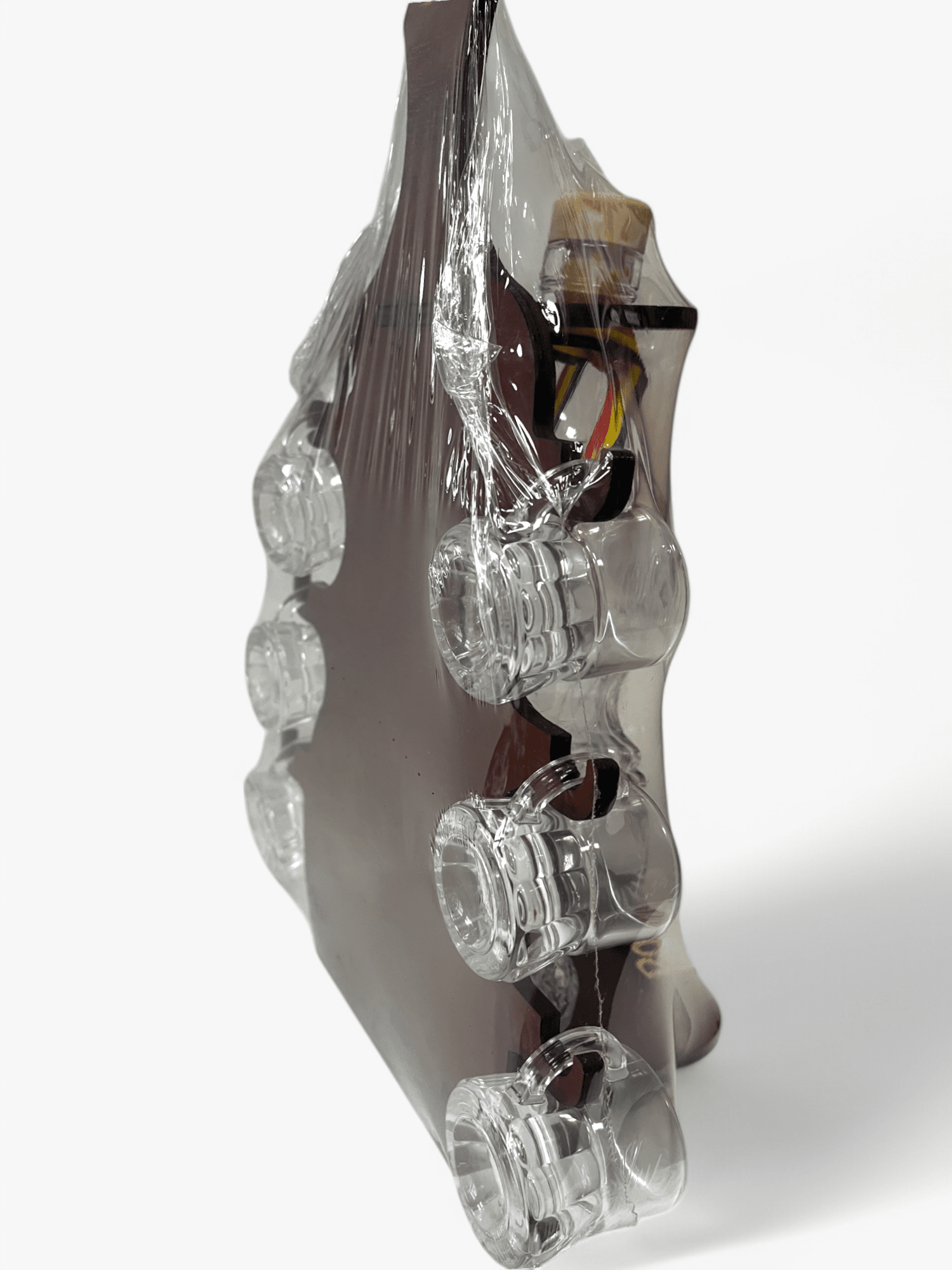 7-piece set for alcoholic beverages, carpenter-shaped bottle and 6 small log-shaped glasses