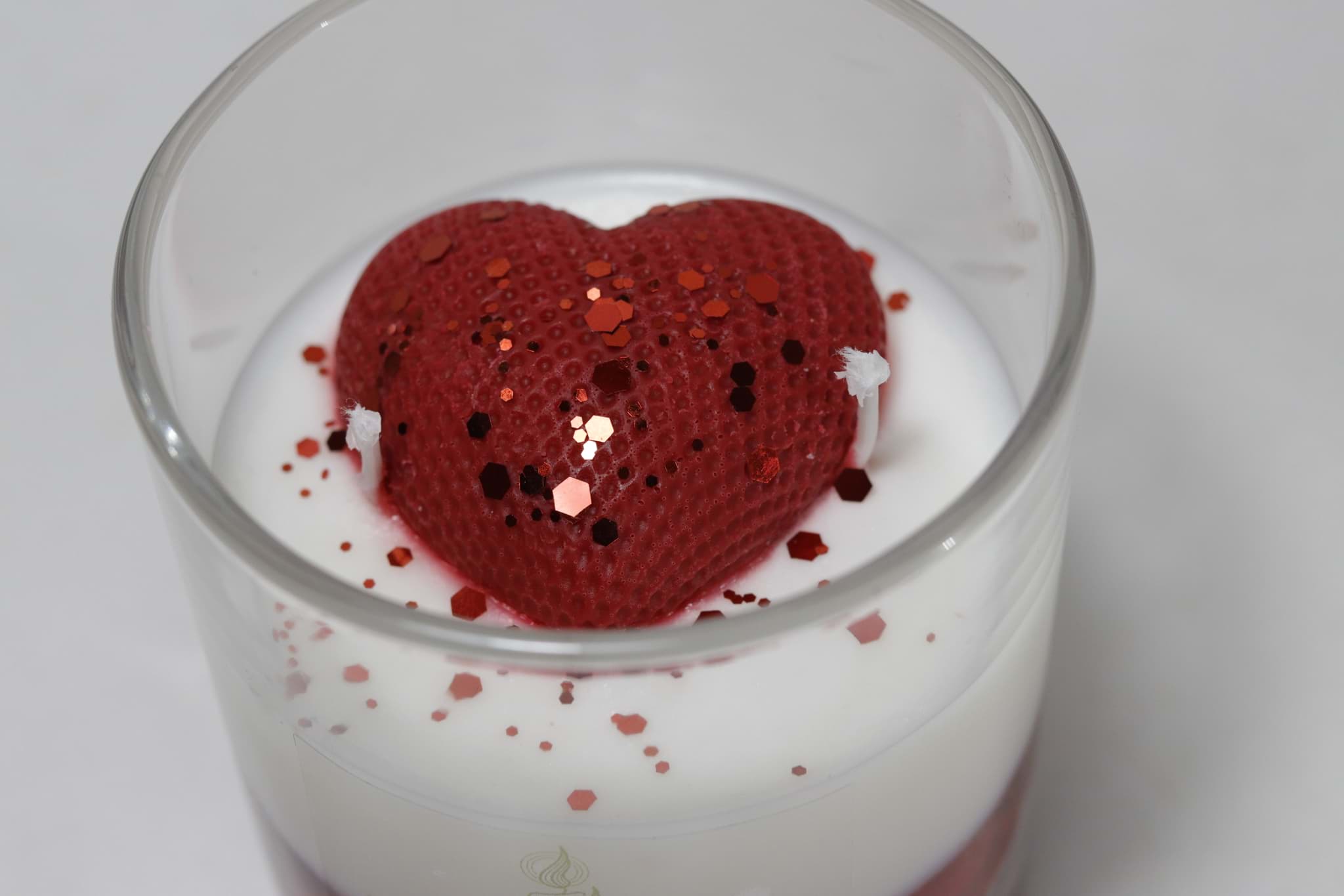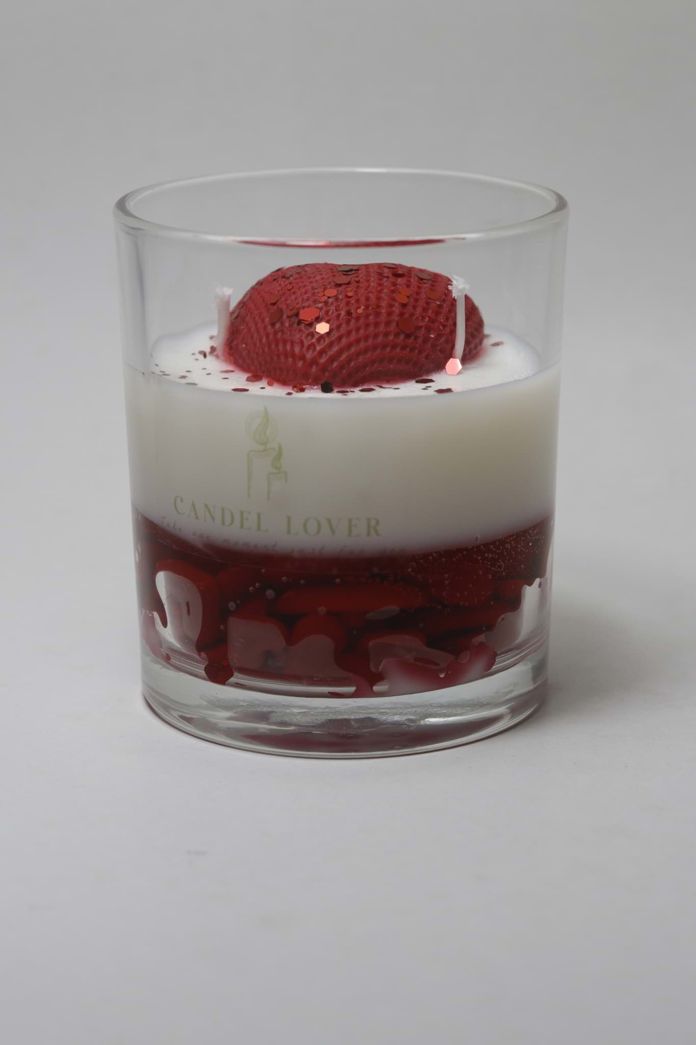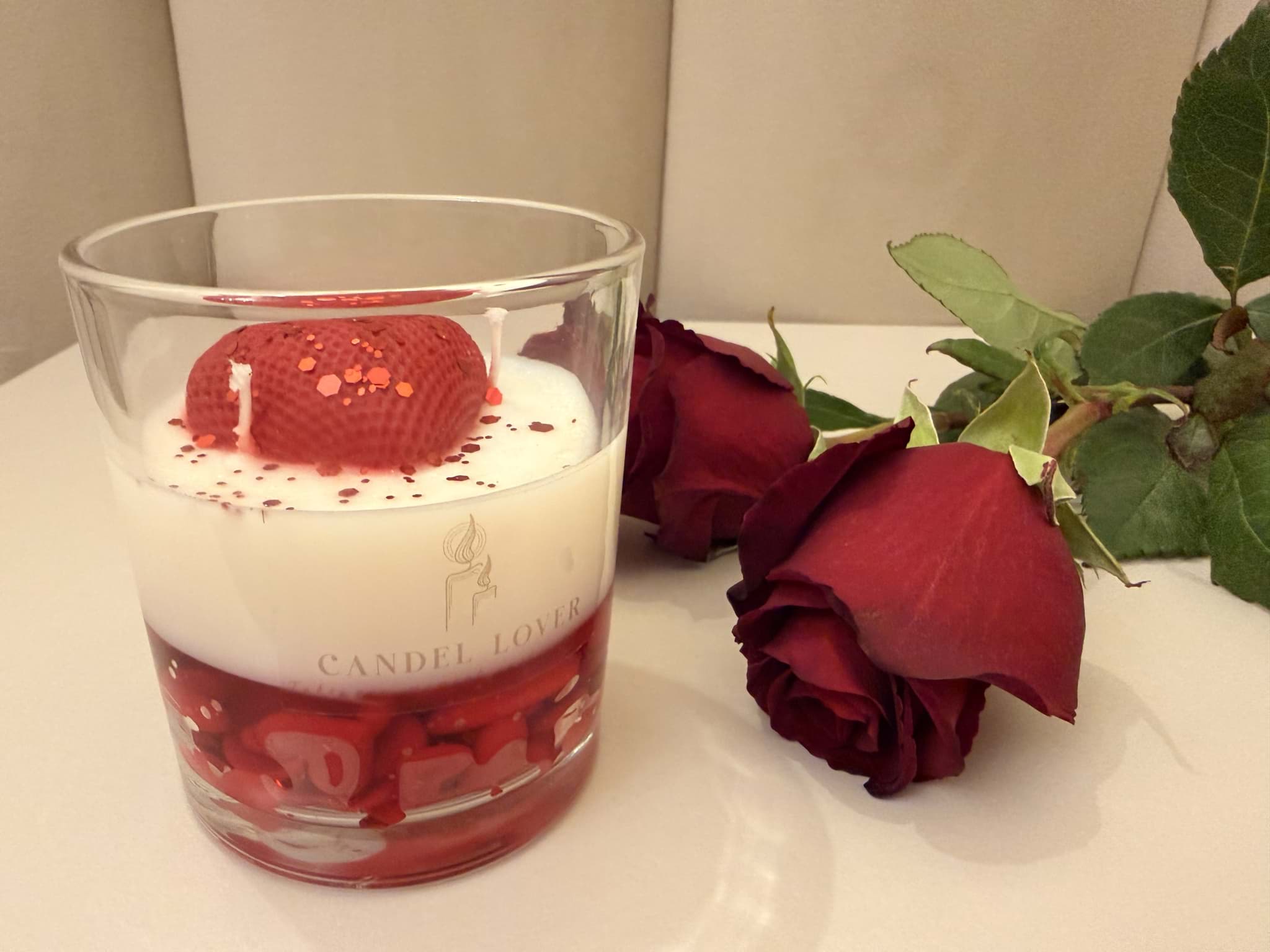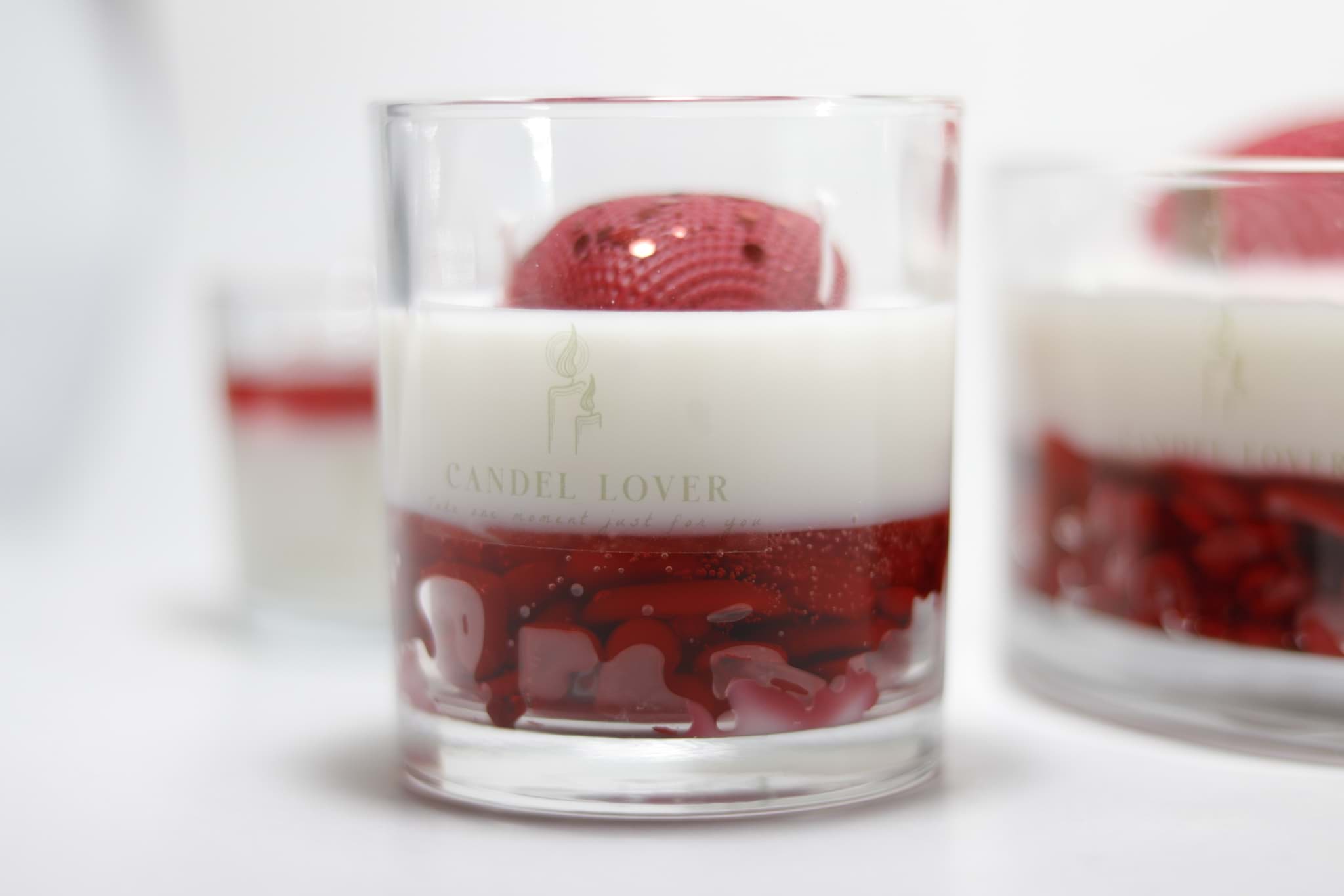 Lumânare decorativă realizată din ceară naturală de soia, cu un design elegant și romantic. Stratul inferior este transparent, cu inserții decorative roșii, iar stratul superior din ceară de soia albă oferă un contrast rafinat și un aspect curat.