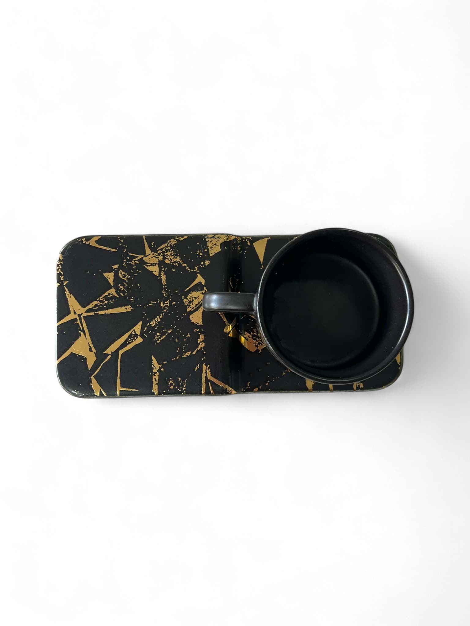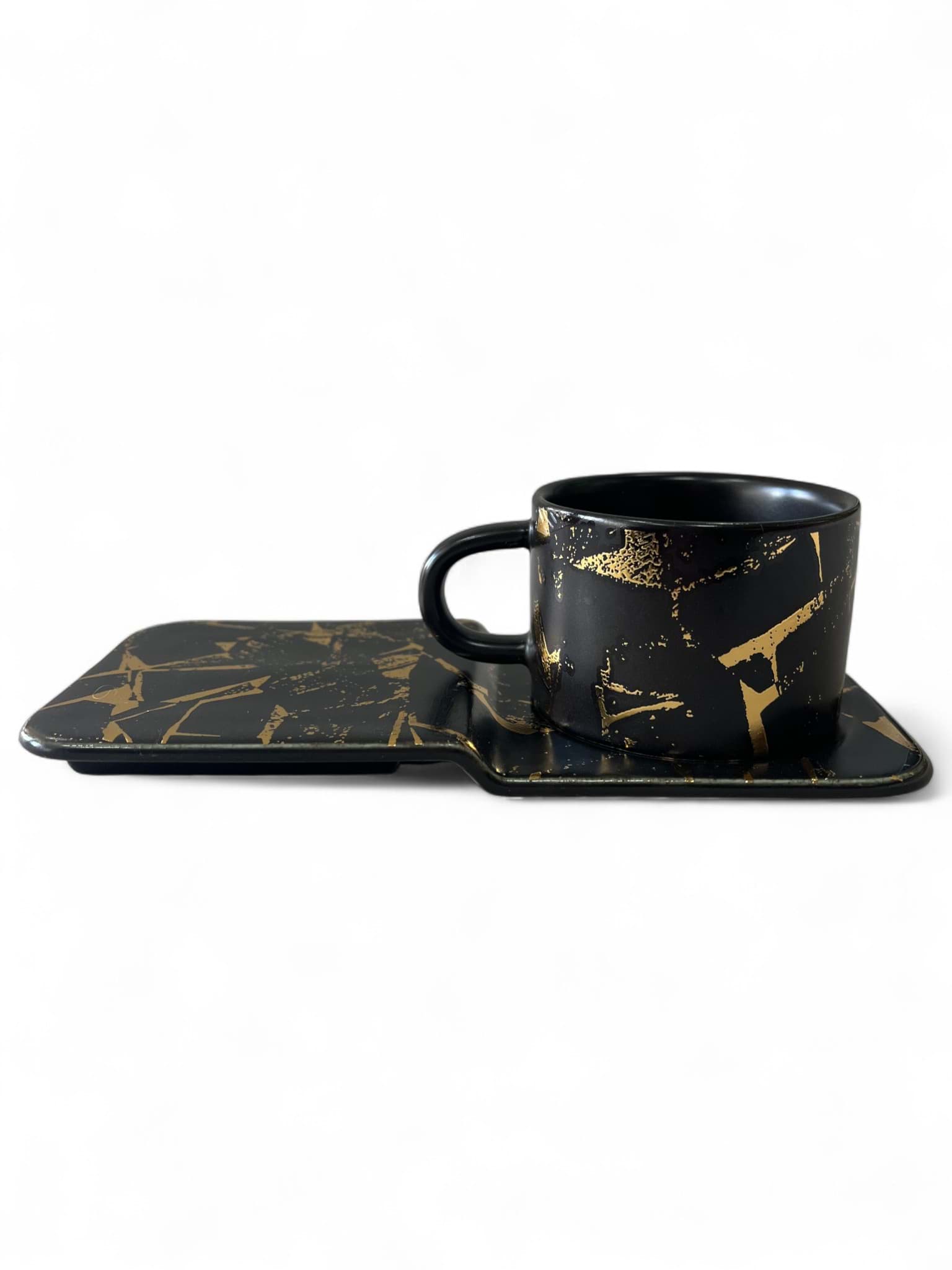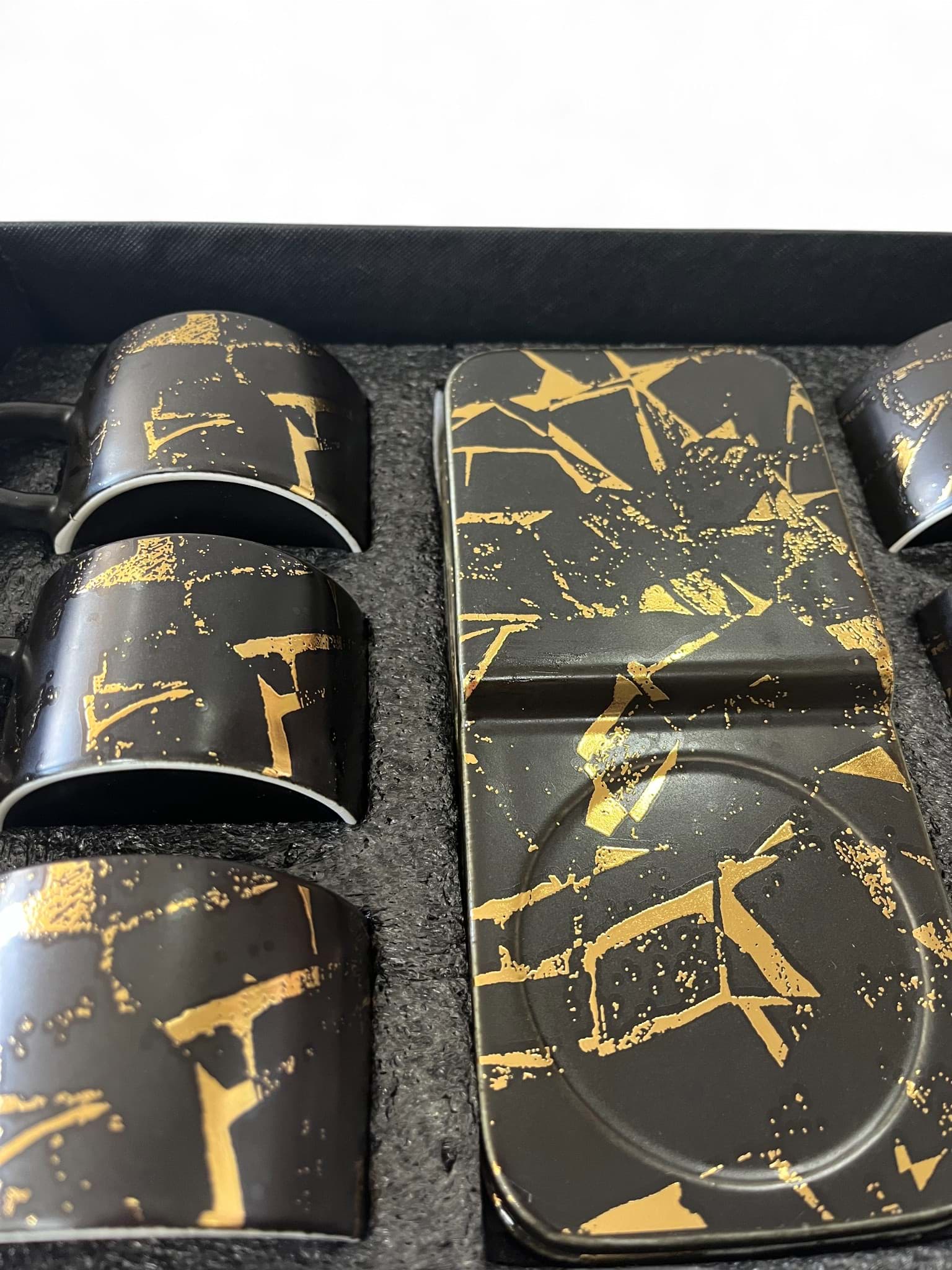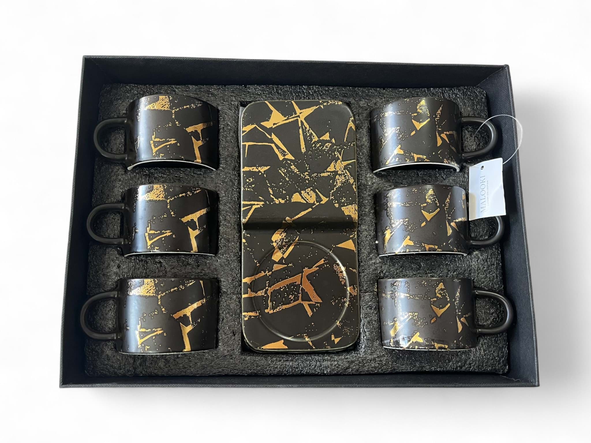 Setul Malooki aduce un plus de stil ritualului zilnic al cafelei. Cele șase cești negre, accentuate de detalii aurii, se îmbină armonios cu farfuriile dreptunghiulare, creând un aspect vizual modern și luxos. Contrastul dintre negru și auriu conferă eleganță, transformând servirea cafelei într-o experiență specială. Dimensiunile ceștilor sunt ideale pentru o cafea espresso sau o cafea scurtă, permițând savurarea aromei intense.