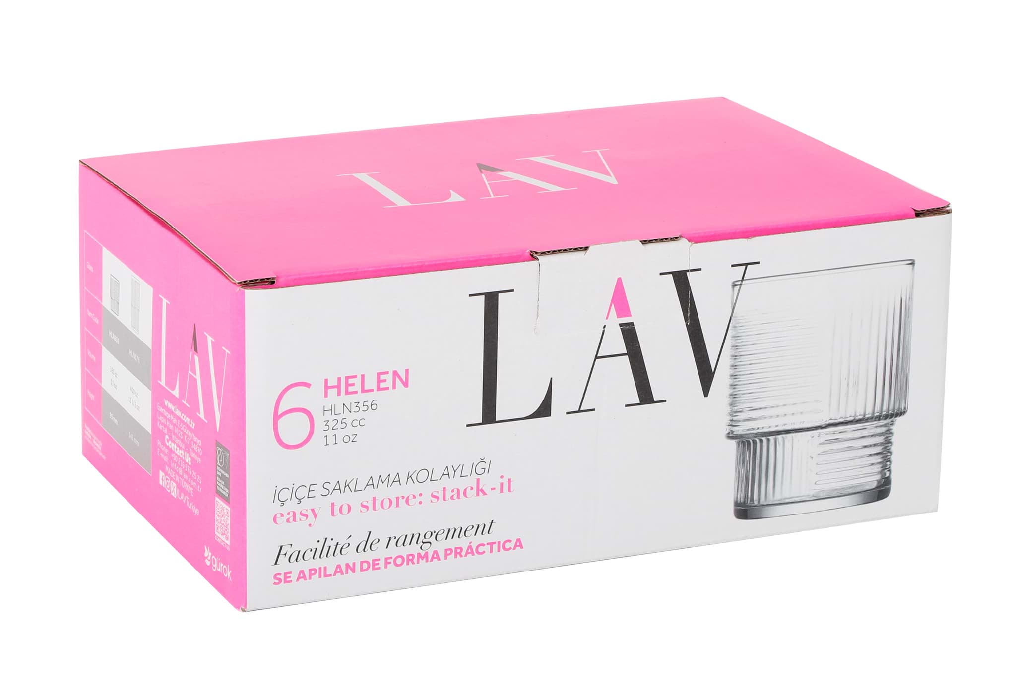 Setul de 6 pahare LAV HELEN, cu o capacitate de 325 ml, este conceput pentru a aduce un plus de eleganță oricărei mese. Forma sa distinctivă și liniile fine oferă o experiență vizuală plăcută, transformând servirea băuturilor într-un moment special. Fie că este vorba de apă, suc sau alte băuturi răcoritoare, aceste pahare vor completa perfect aranjamentul mesei tale.