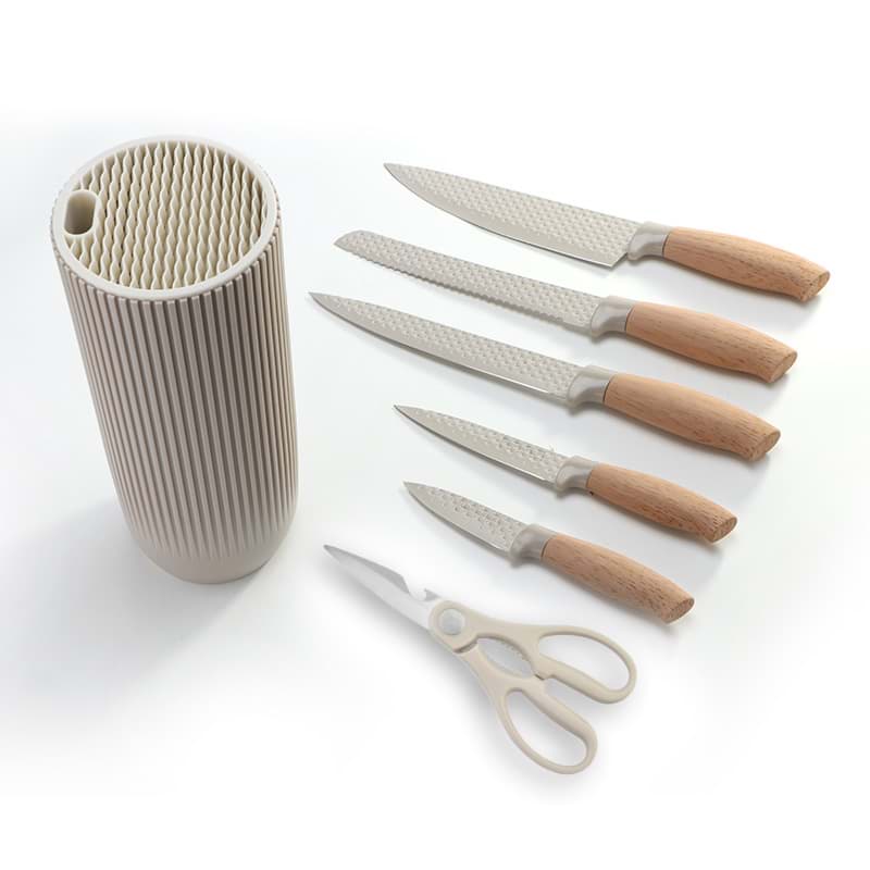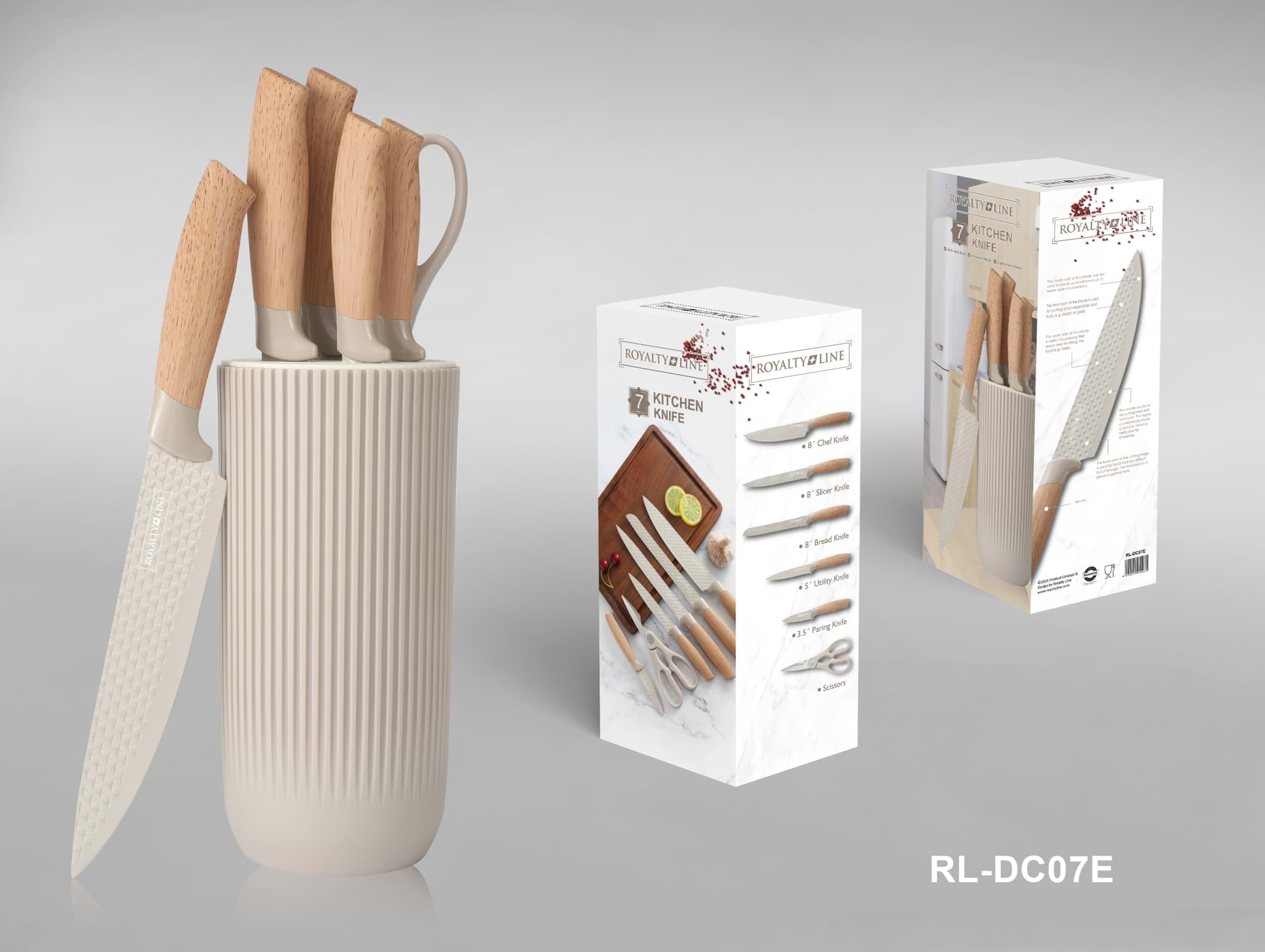 Setul de 7 cuțite Royalty Line DC07E aduce un plus de stil în orice bucătărie, datorită designului său elegant și a culorii crem, care se integrează ușor în orice decor. Suportul inclus nu doar că oferă o modalitate practică de a depozita cuțitele, dar și le pune în valoare, transformându-le într-un element decorativ. Fiecare cuțit este conceput pentru a oferi o experiență de utilizare plăcută și eficientă, combinând estetica cu funcționalitatea.