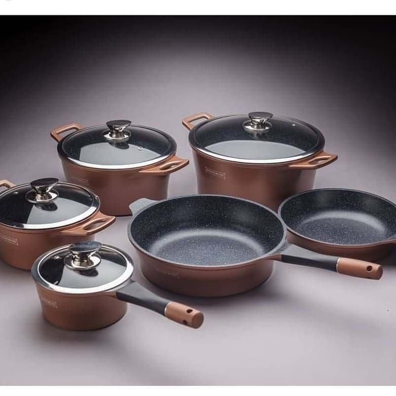 Setul include o varietate de oale și tigăi de diferite dimensiuni, fiecare dotată cu capace rezistente, oferindu-ți flexibilitatea de a pregăti o gamă largă de rețete. De la supe și tocănițe, până la fripturi și omlete, acest set te echipează complet pentru orice provocare culinară. Materialele de înaltă calitate utilizate în fabricarea acestui set garantează durabilitate și rezistență în timp, asigurându-ți că vei beneficia de performanțe excelente pentru mulți ani de acum încolo.