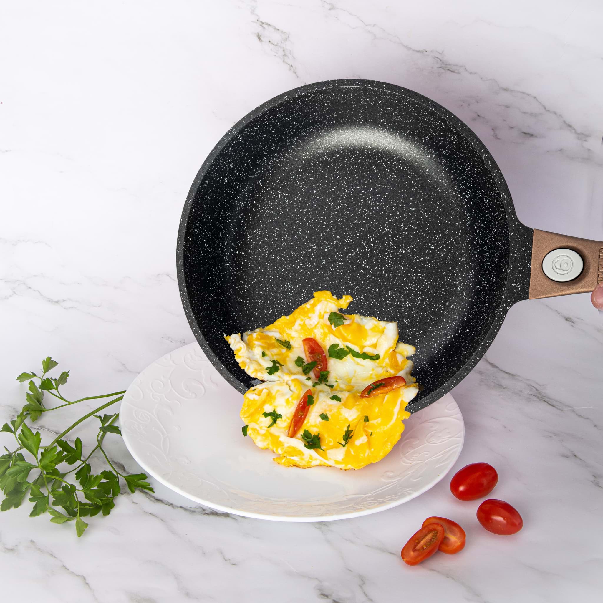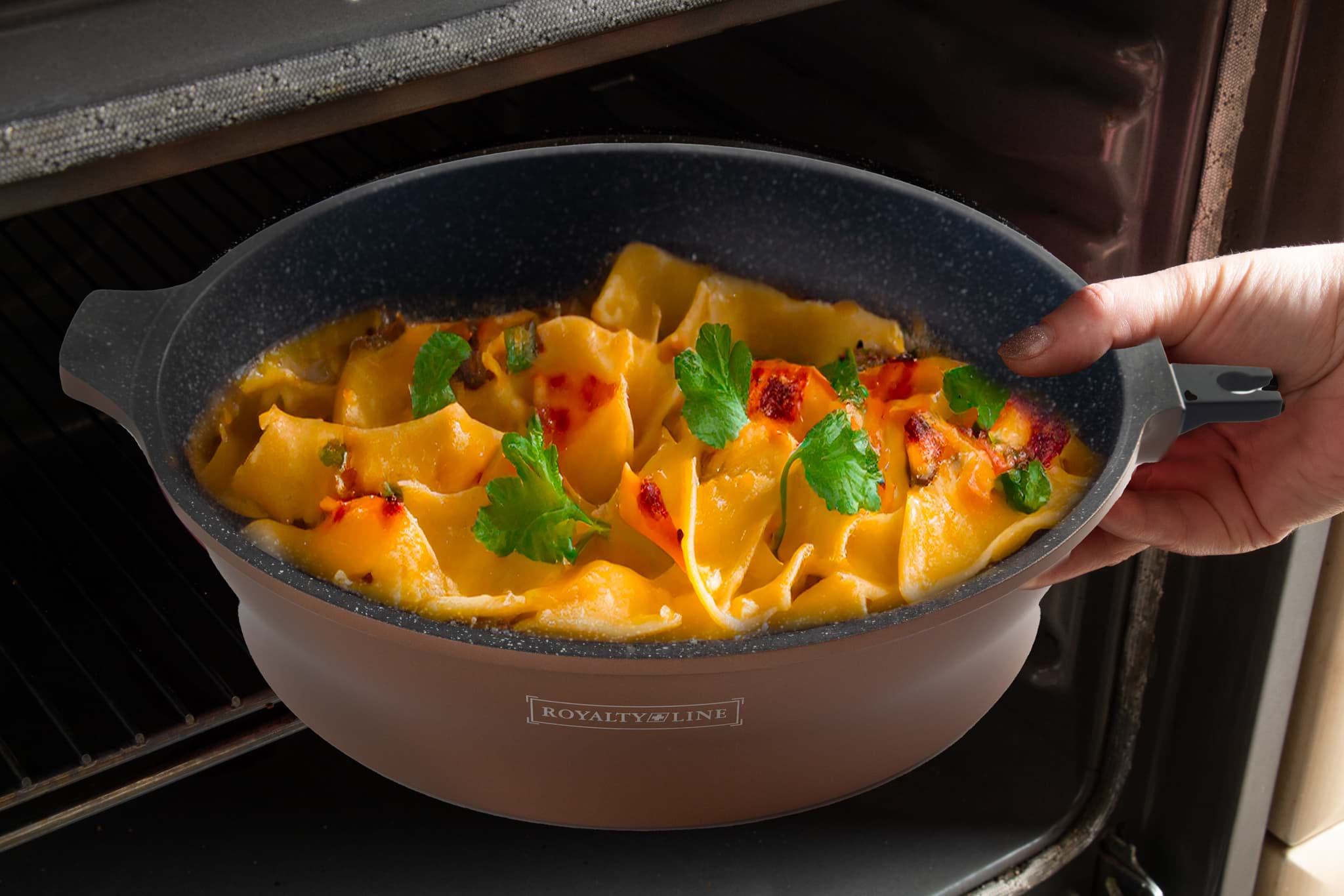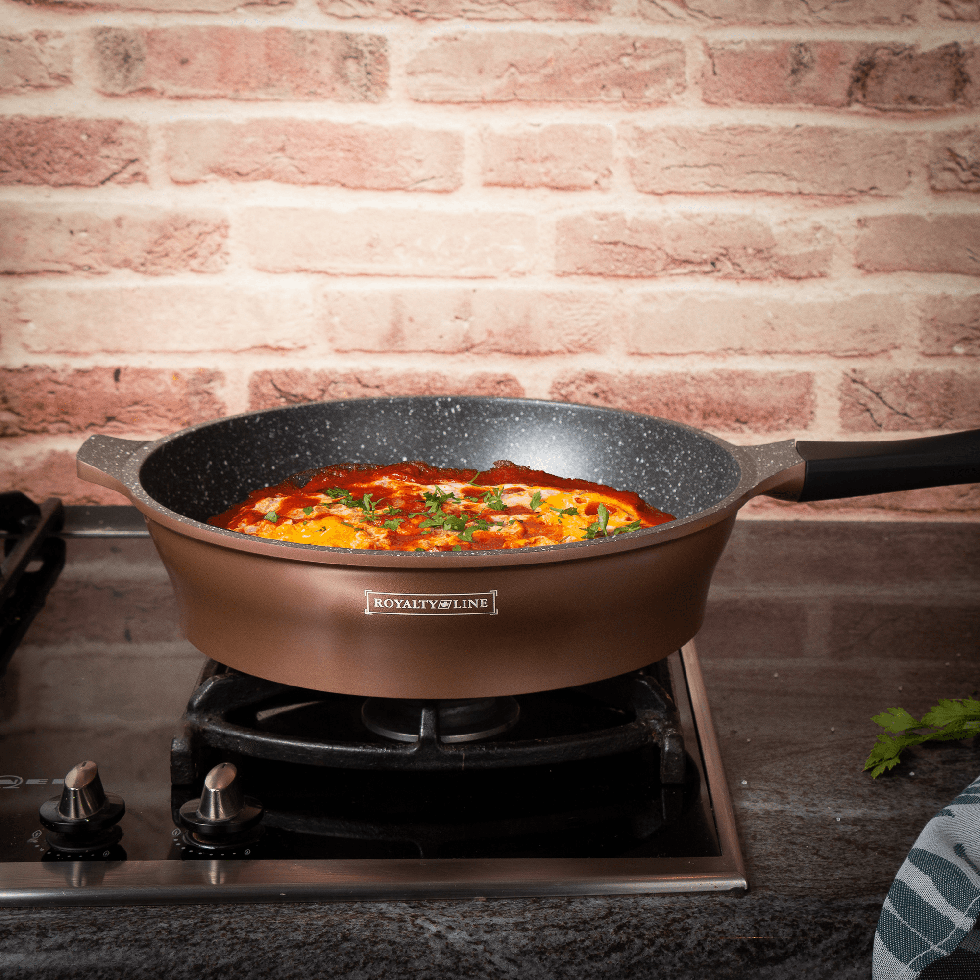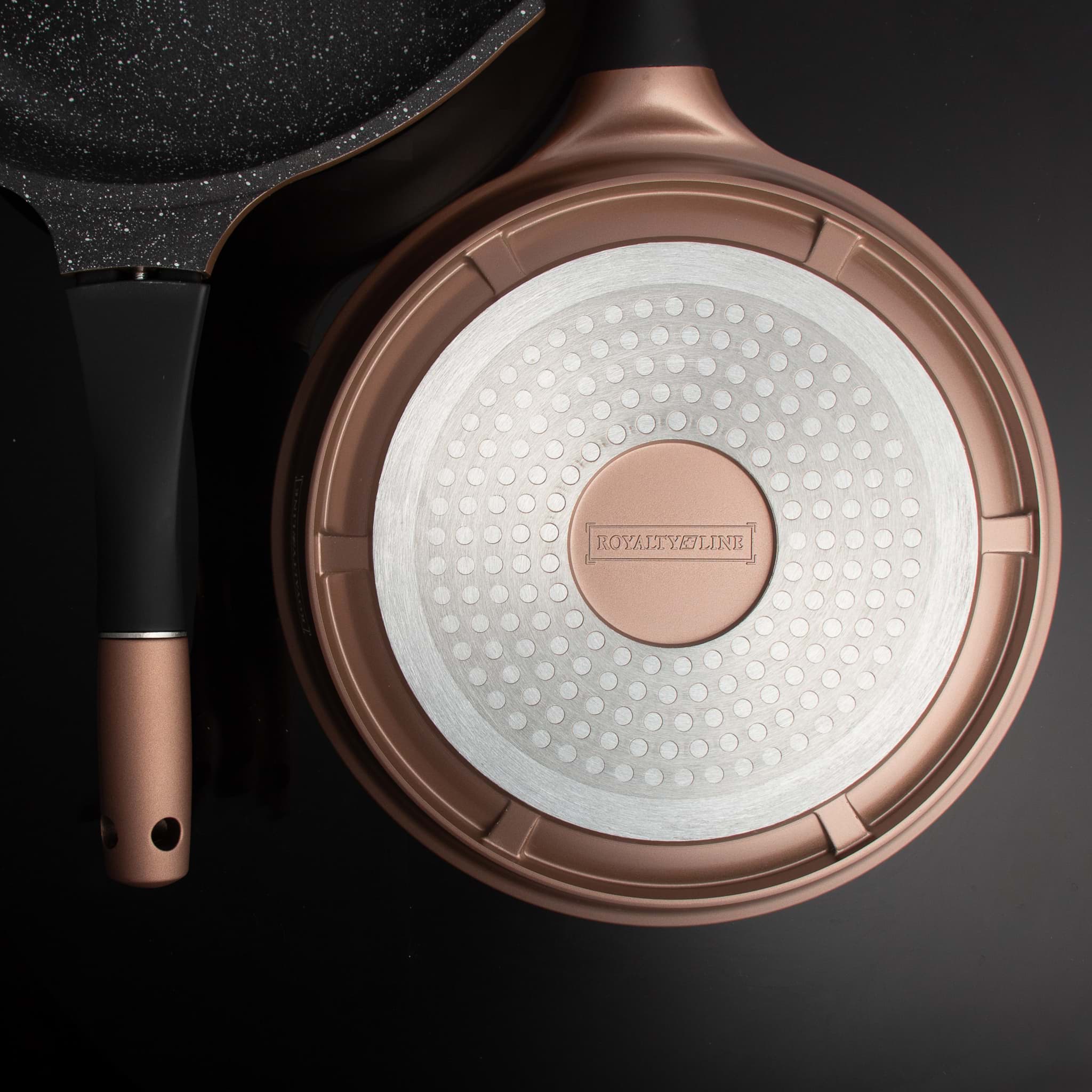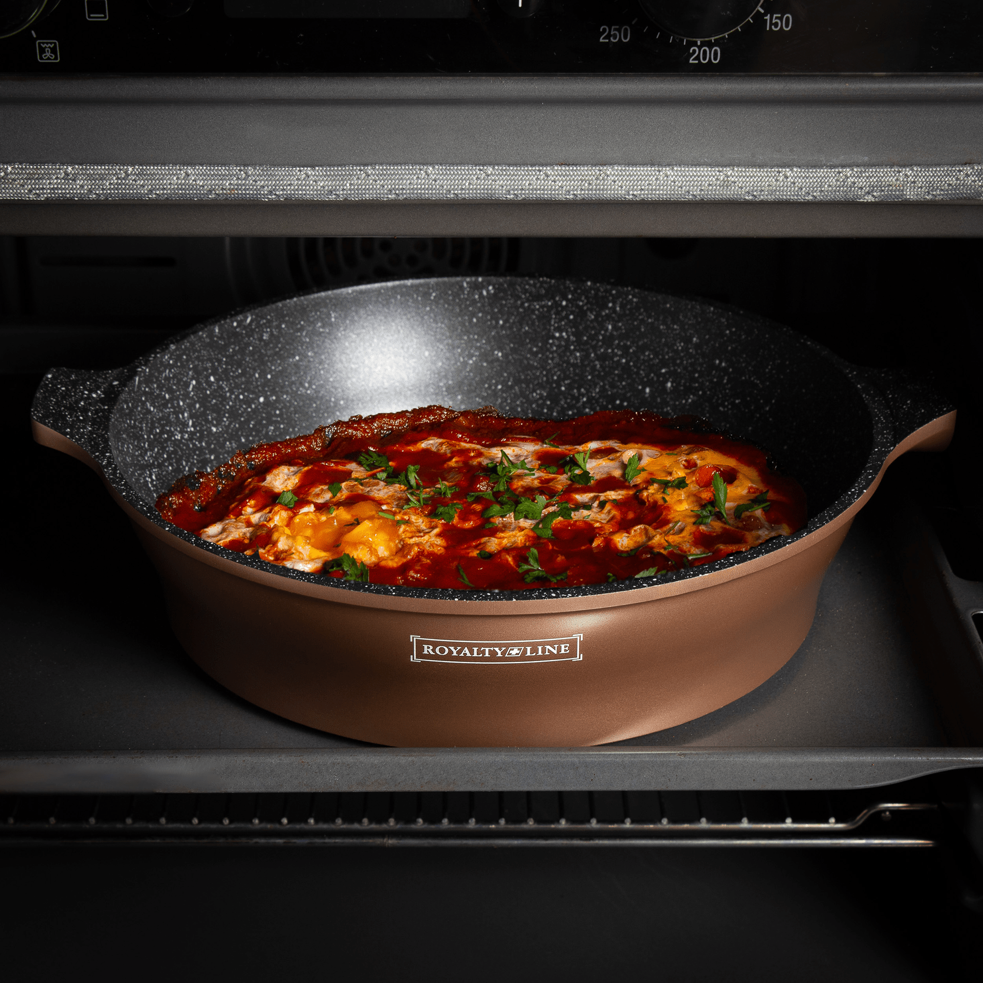 Experimentează o nouă dimensiune a gătitului cu setul Royalty Line ES2014M, un set de 17 piese esențiale pentru orice bucătărie modernă. Acesta combină funcționalitatea superioară cu un design elegant, transformând fiecare masă într-o experiență culinară de neuitat. Cu un finisaj de culoare cupru atrăgător, acest set adaugă o notă de rafinament spațiului tău culinar. Beneficiază de proprietățile antiaderente avansate oferite de învelișul tip marmură, care asigură o gătire uniformă și previne lipirea alimentelor, facilitând curățarea ulterioară.