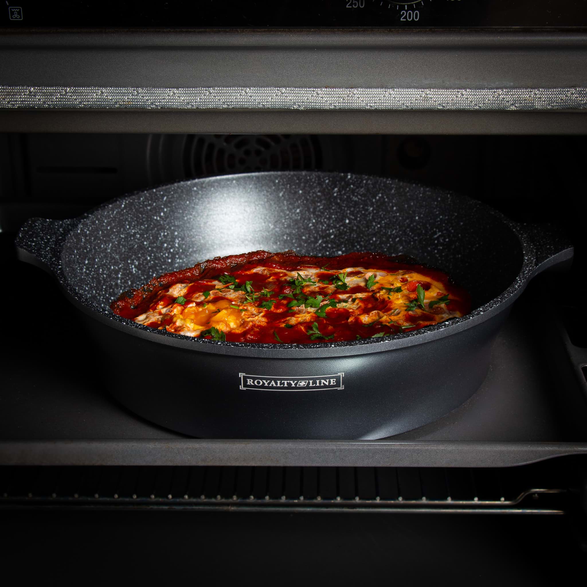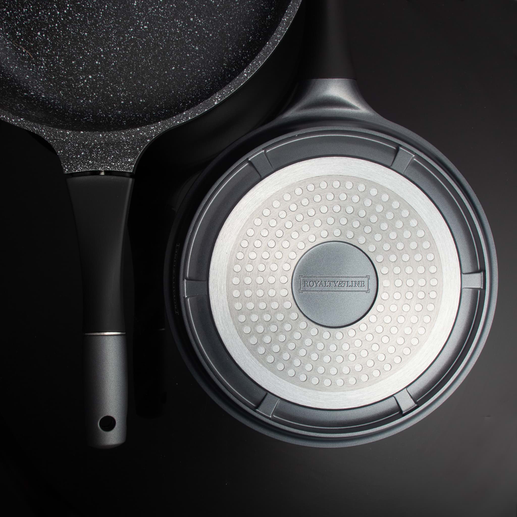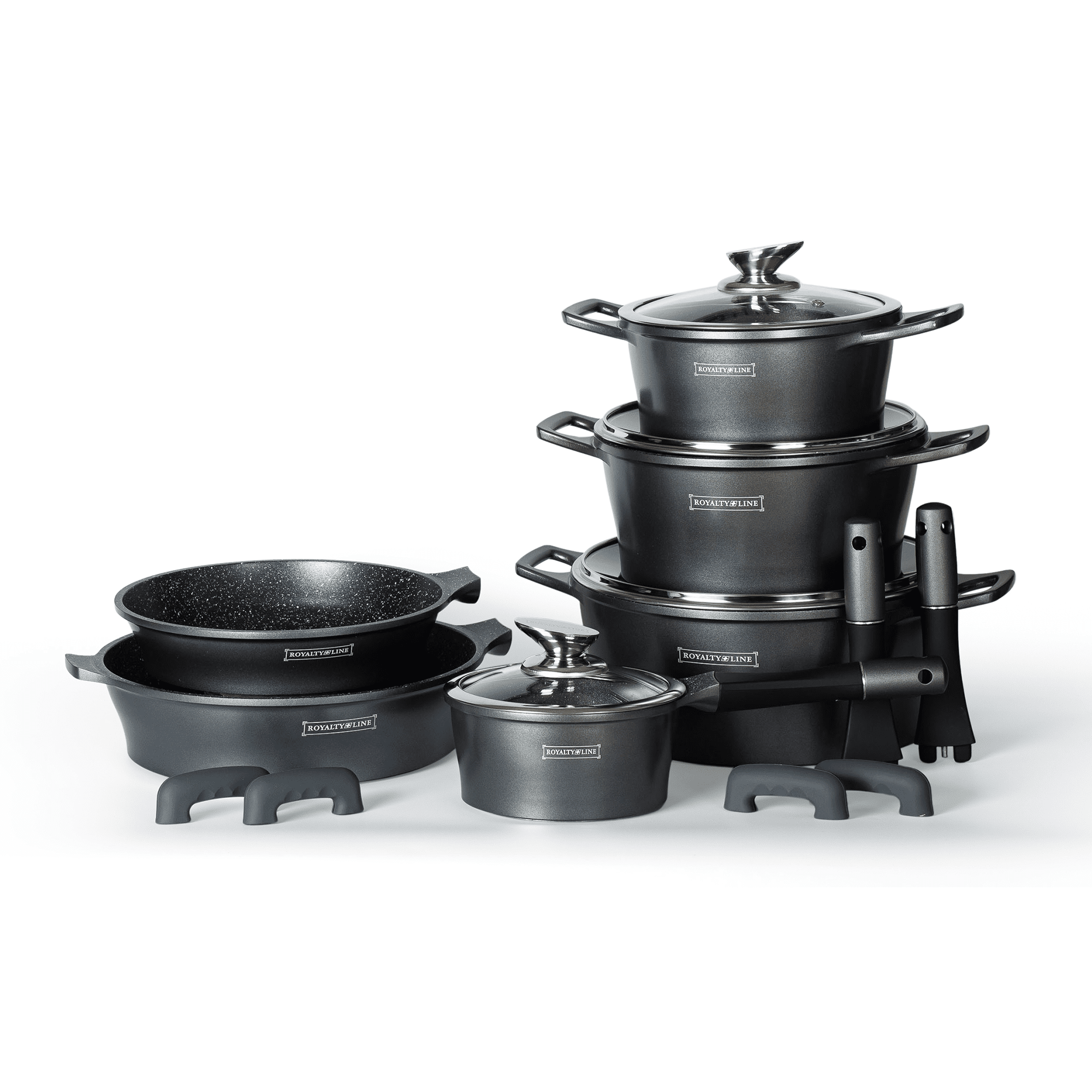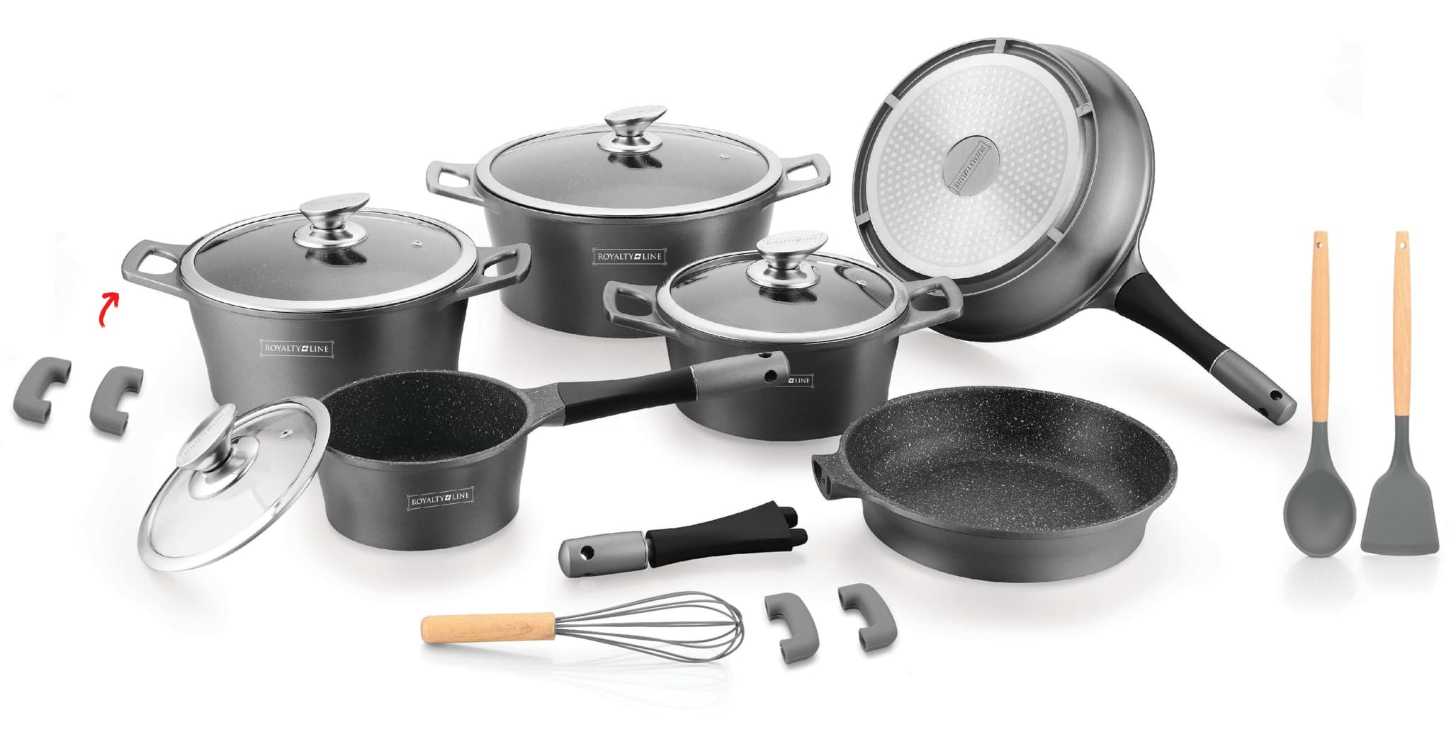 Acest set de vase de gătit Royalty Line ES1014M include 17 piese esențiale pentru orice bucătărie. Vasele sunt fabricate cu un înveliș antiaderent tip marmură, ceea ce facilitează gătirea și curățarea. Setul include diverse dimensiuni de oale și tigăi, fiecare prevăzută cu capac. Culoarea gri oferă un aspect modern și elegant, integrându-se ușor în orice decor. Este o alegere excelentă pentru cei care doresc un set complet și funcțional de vase de gătit.
