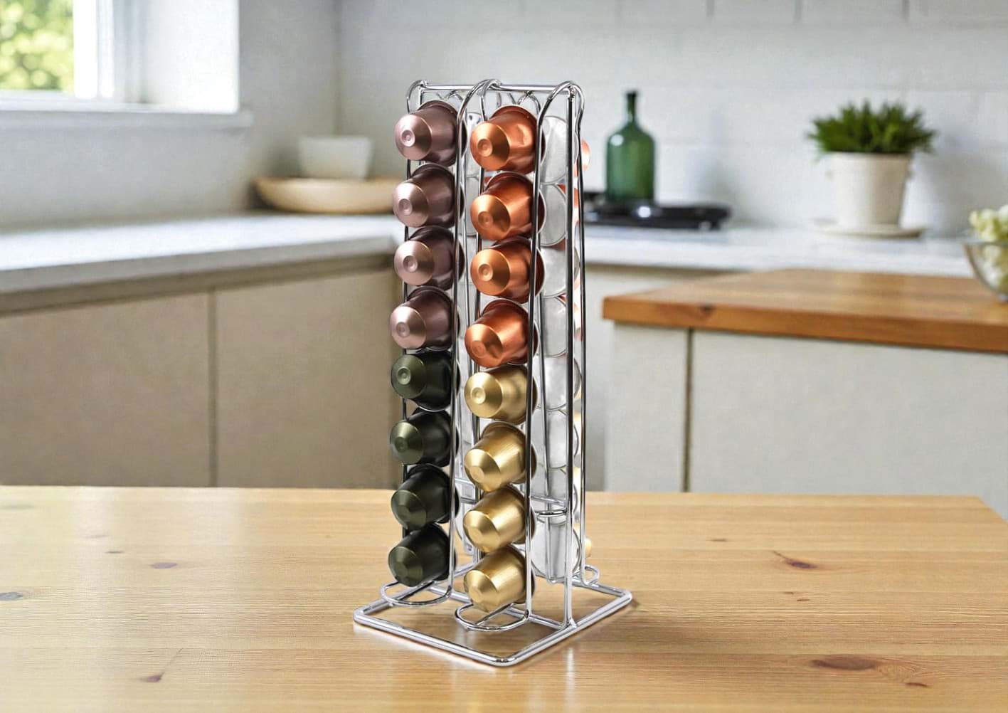 Suportul este conceput pentru a economisi spațiu și a oferi acces rapid la capsulele de cafea. Designul său simplu și elegant se integrează ușor în orice decor de bucătărie sau birou. Materialele utilizate asigură durabilitate și o curățare ușoară, menținând aspectul ordonat al zonei de cafea.