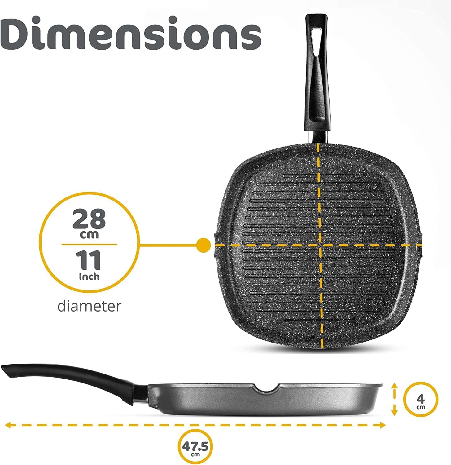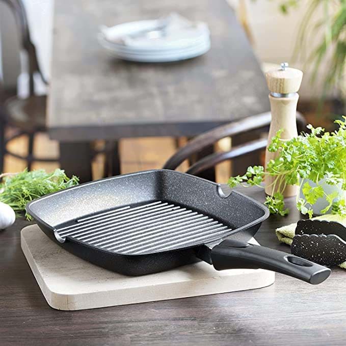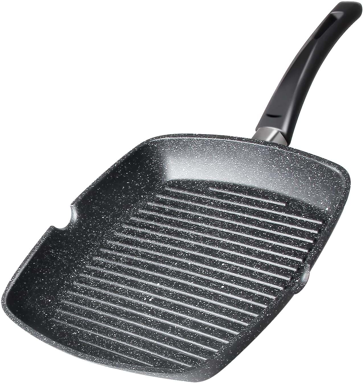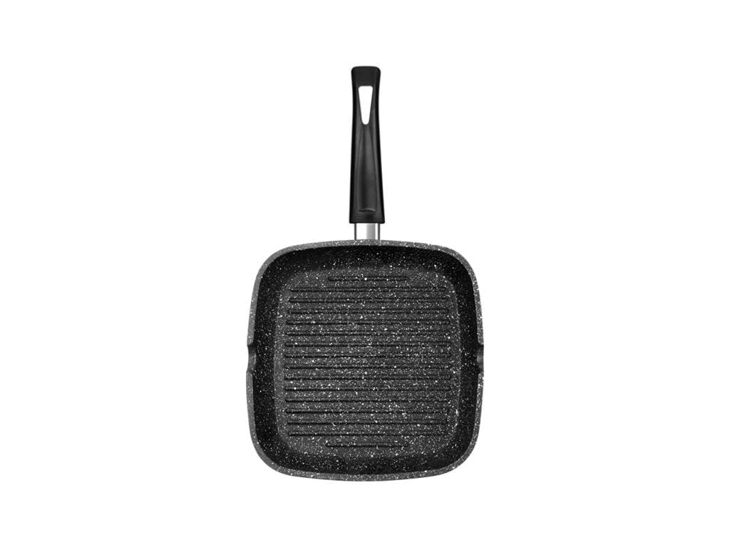 Această tigaie grill este concepută pentru a distribui uniform căldura, asigurând o gătire uniformă a alimentelor. Designul cu striații ajută la scurgerea grăsimilor, rezultând preparate mai sănătoase. Materialele de fabricație sunt durabile, asigurând o utilizare îndelungată. Tigaia este ușor de manevrat și de curățat, fiind un accesoriu practic pentru orice bucătărie.
