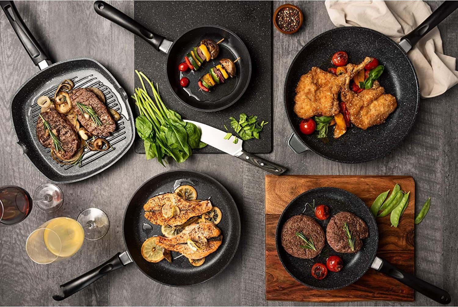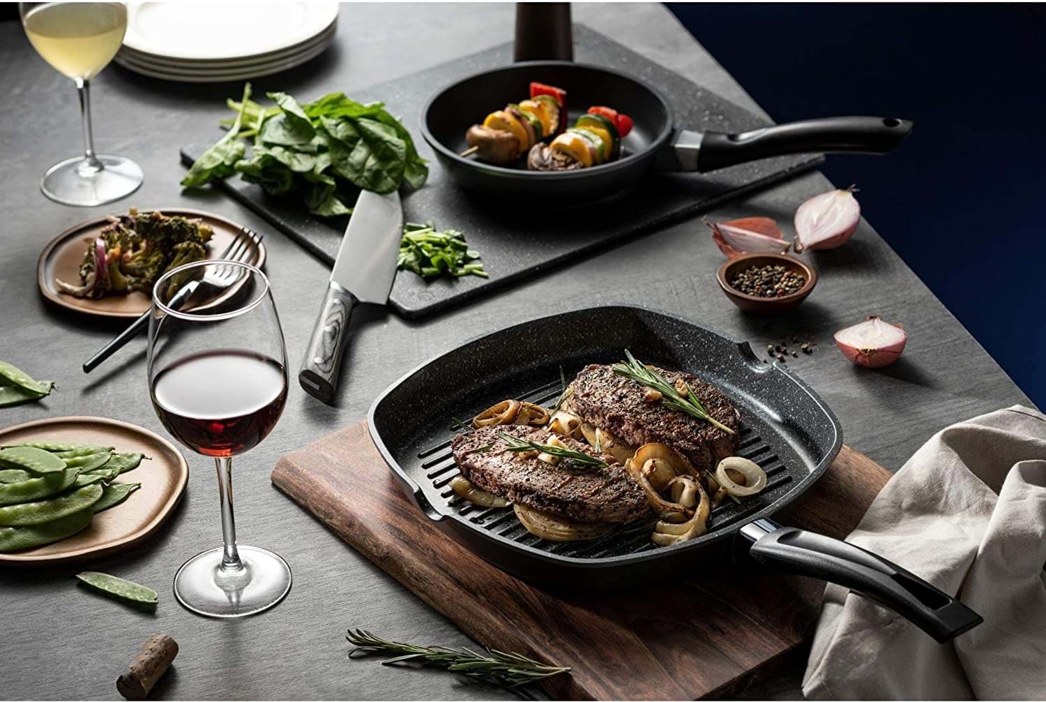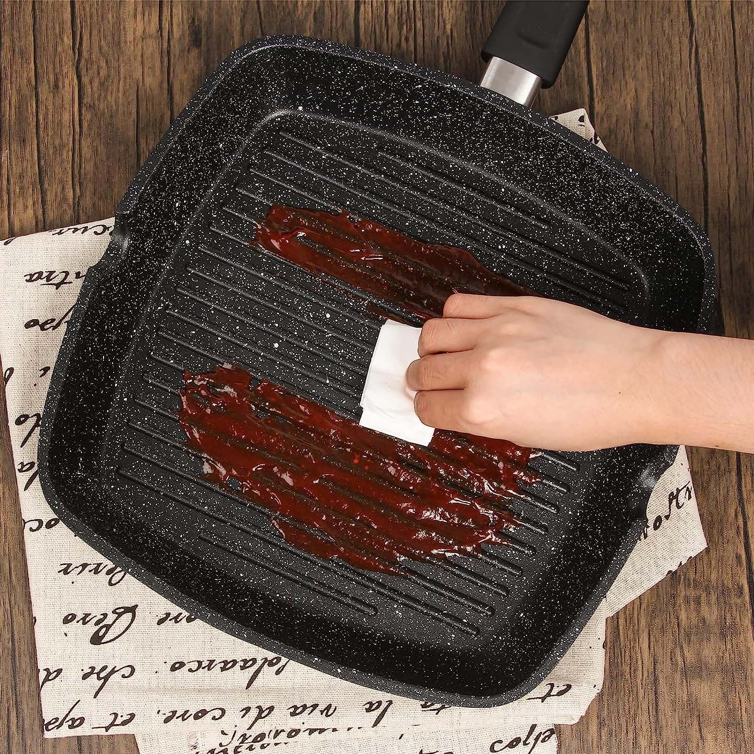 Această tigaie grill este concepută pentru a distribui uniform căldura, asigurând o gătire uniformă a alimentelor. Designul cu striații ajută la scurgerea grăsimilor, rezultând preparate mai sănătoase. Materialele de fabricație sunt durabile, asigurând o utilizare îndelungată. Tigaia este ușor de manevrat și de curățat, fiind un accesoriu practic pentru orice bucătărie.