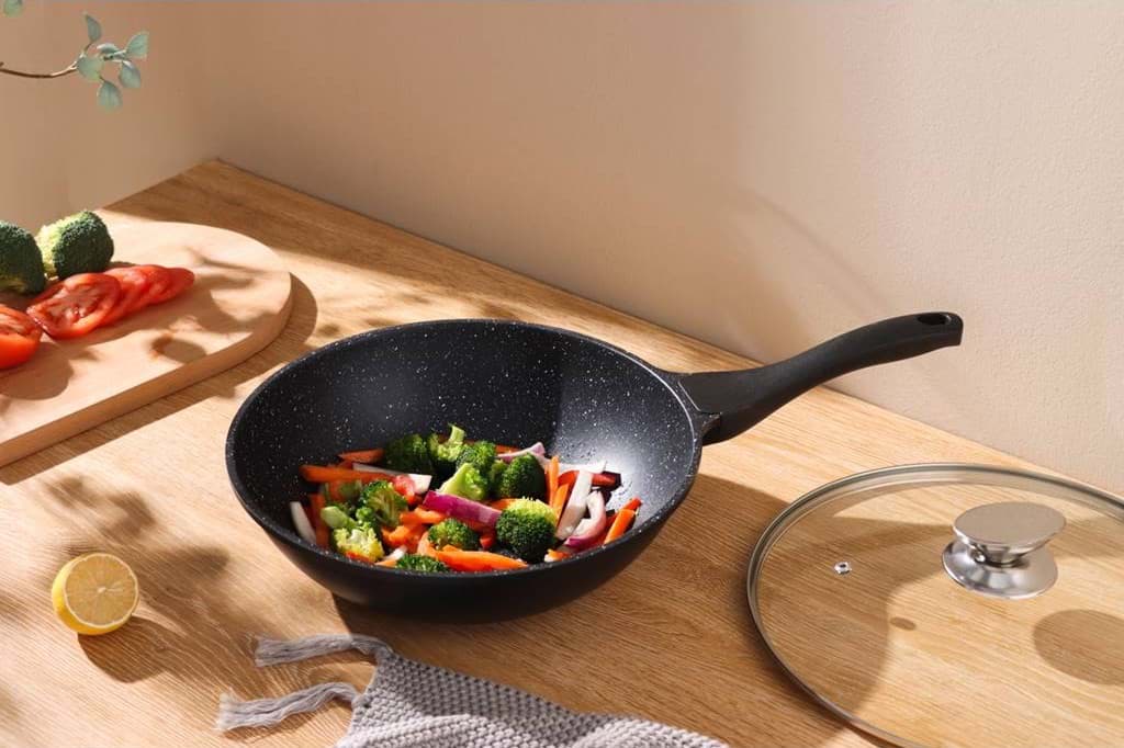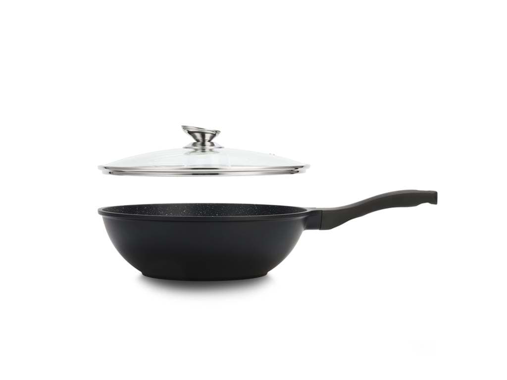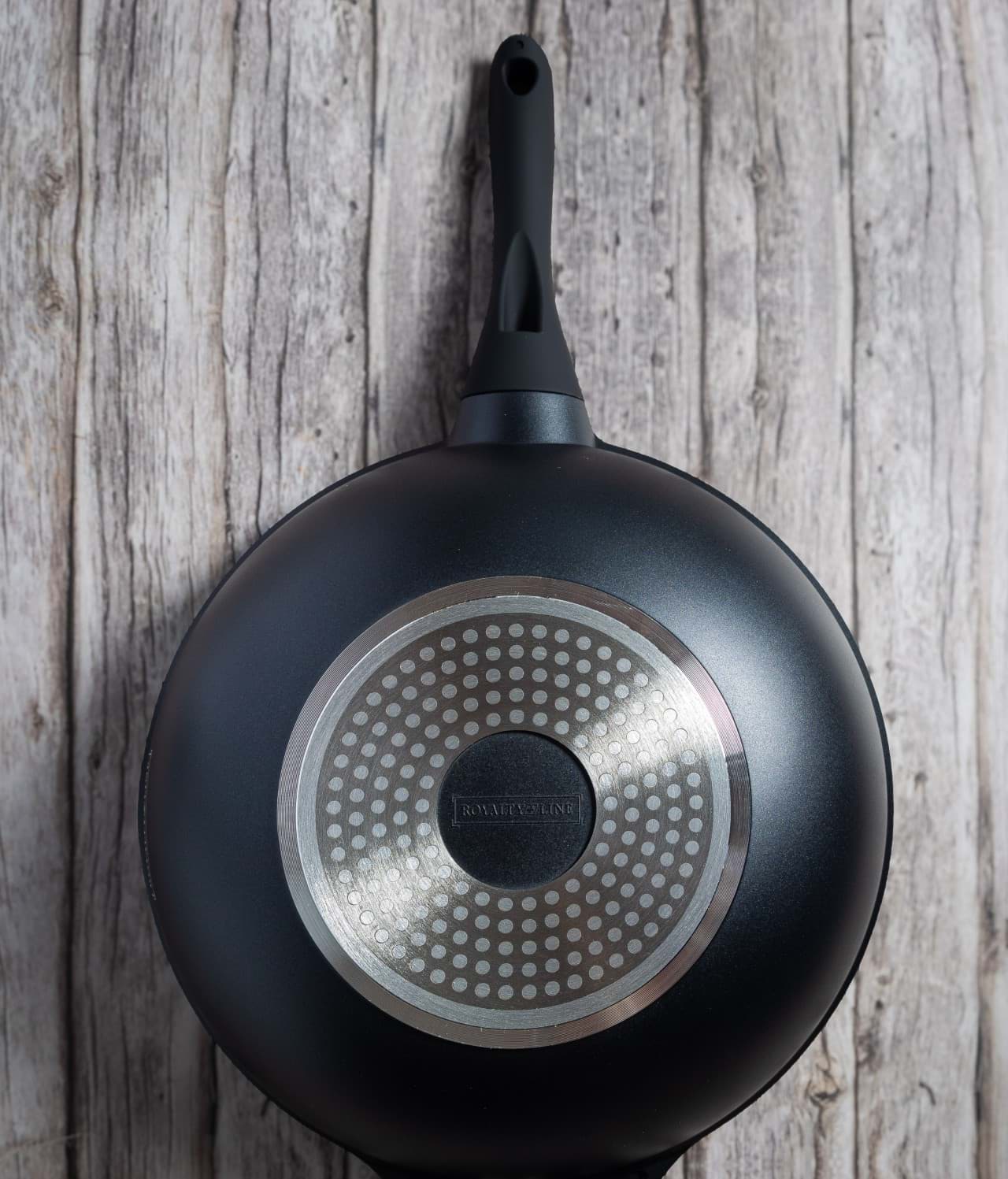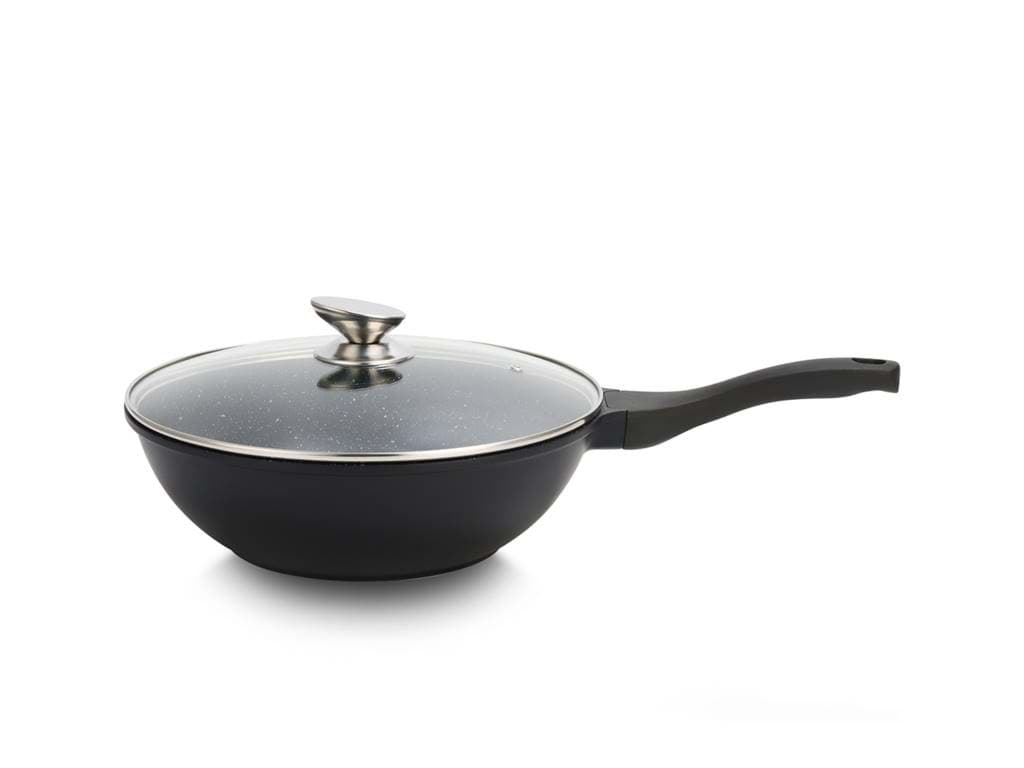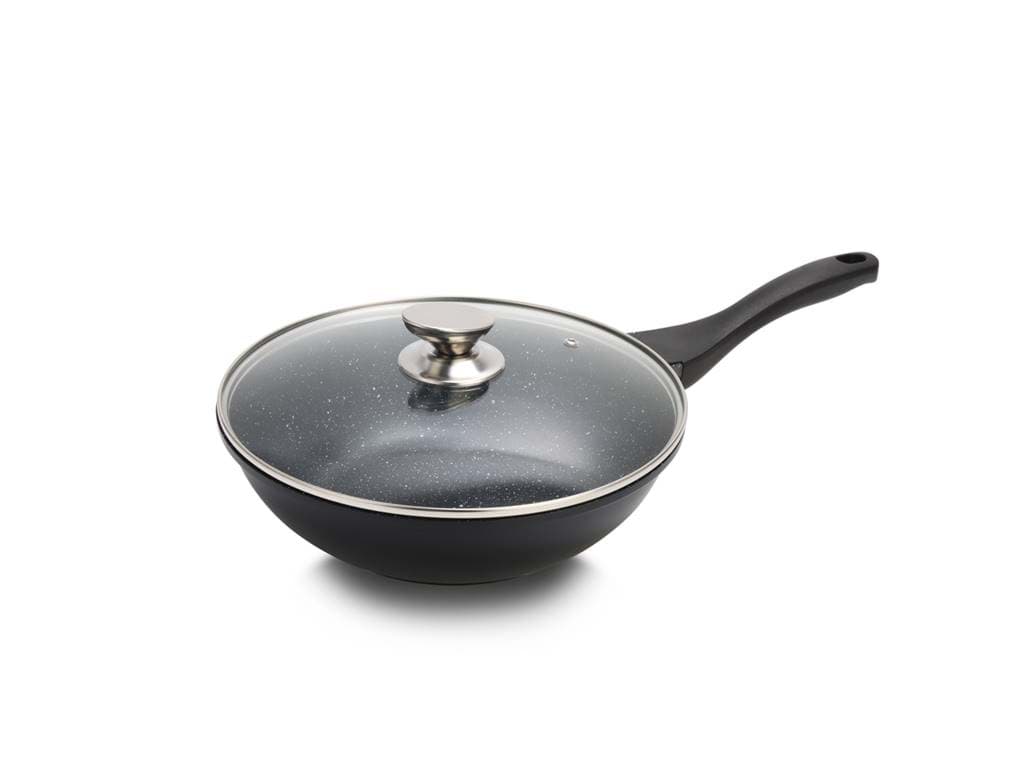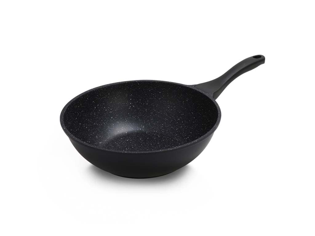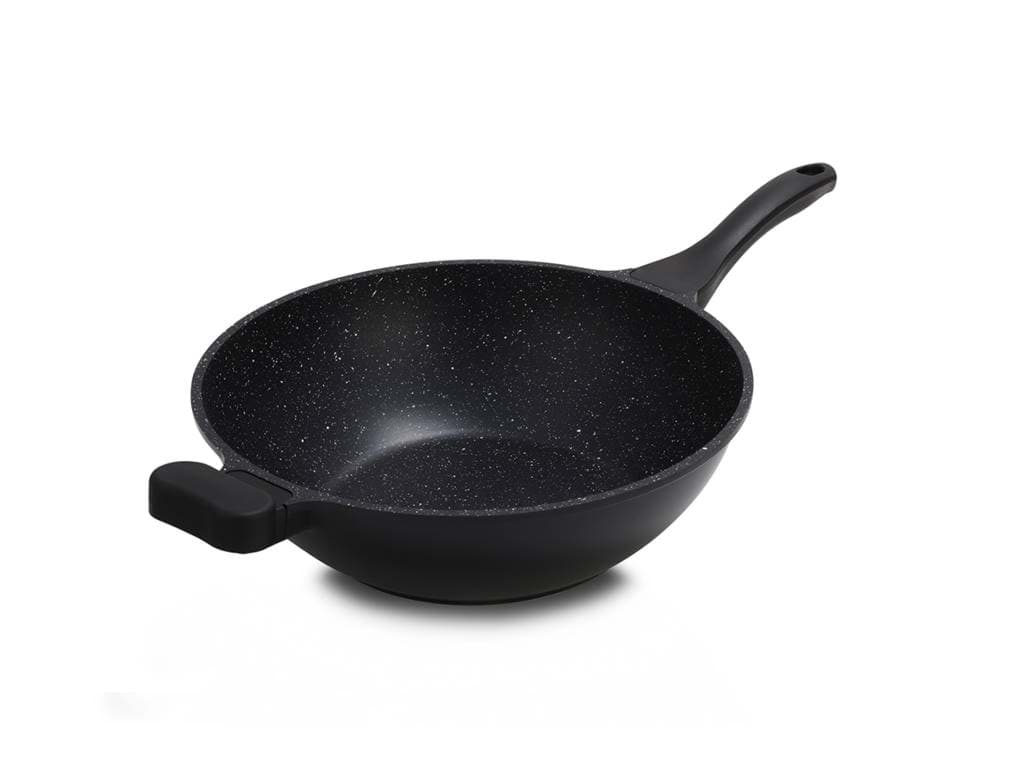 Tigaia Wok Royalty Line, model BW-ML, este proiectată pentru a oferi o experiență culinară superioară, punând accent pe gătitul sănătos și ușor. Învelișul său antiaderent tip marmură asigură că alimentele nu se lipesc, permițând utilizarea unei cantități reduse de ulei sau grăsimi. Această caracteristică nu numai că contribuie la prepararea unor mese mai sănătoase, dar și facilitează curățarea tigăii după utilizare. Designul tip wok, cu margini înalte și fund rotunjit, este ideal pentru a găti rapid și uniform legume, carne și alte ingrediente, menținând aromele și nutrienții esențiali.