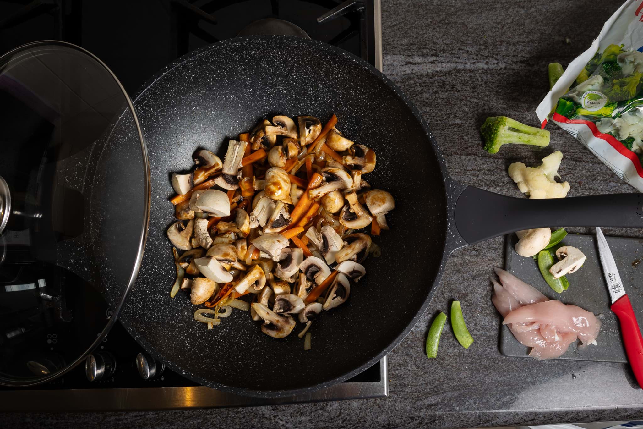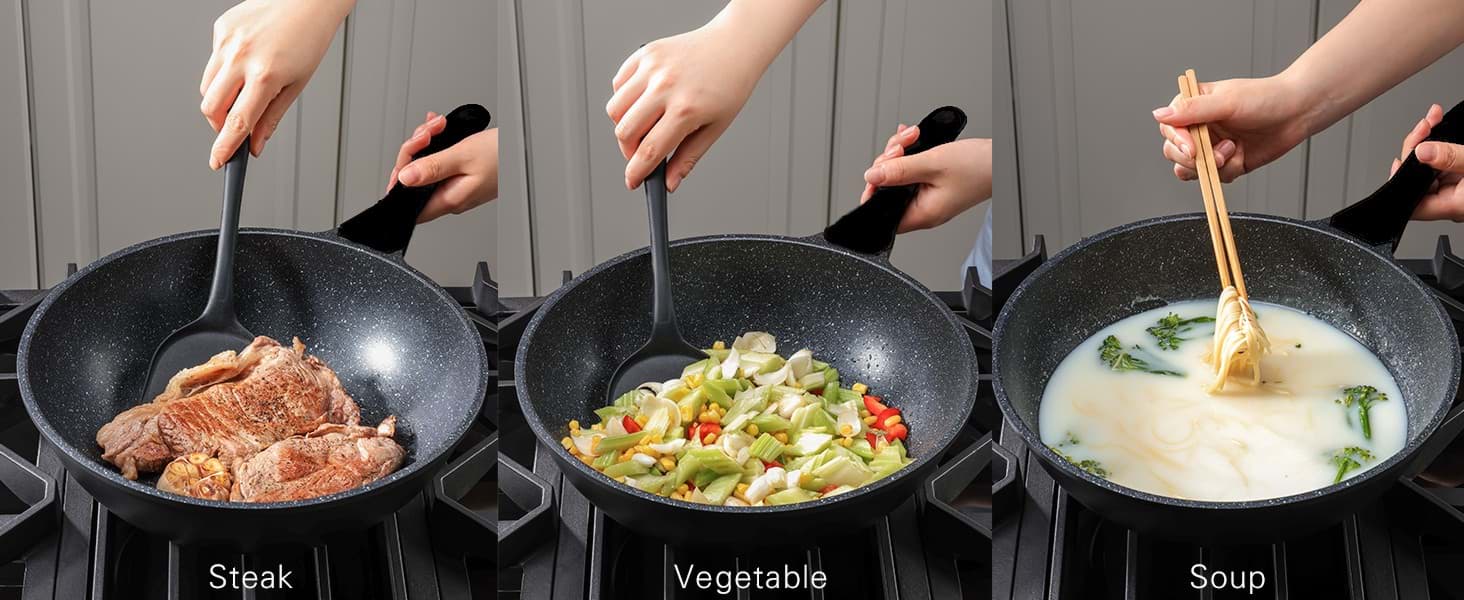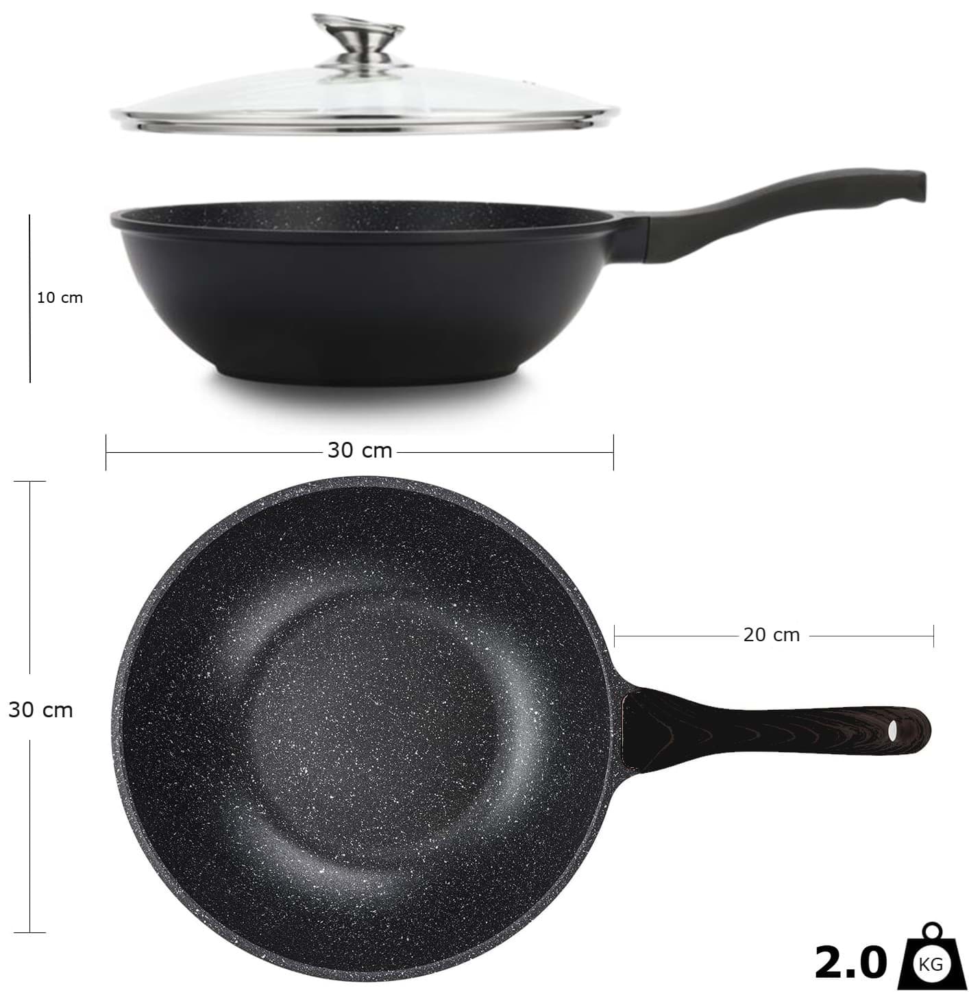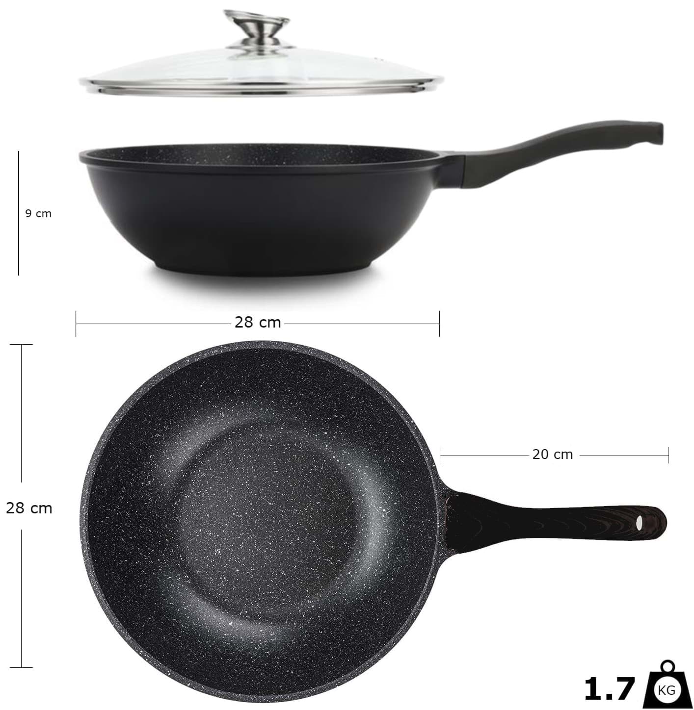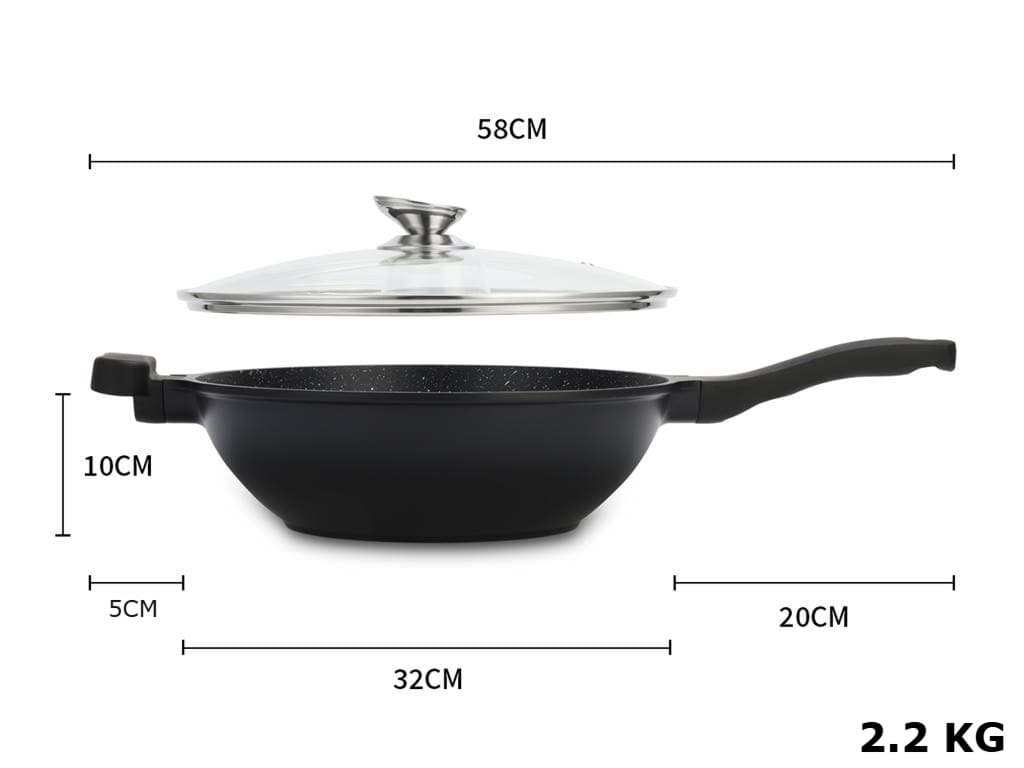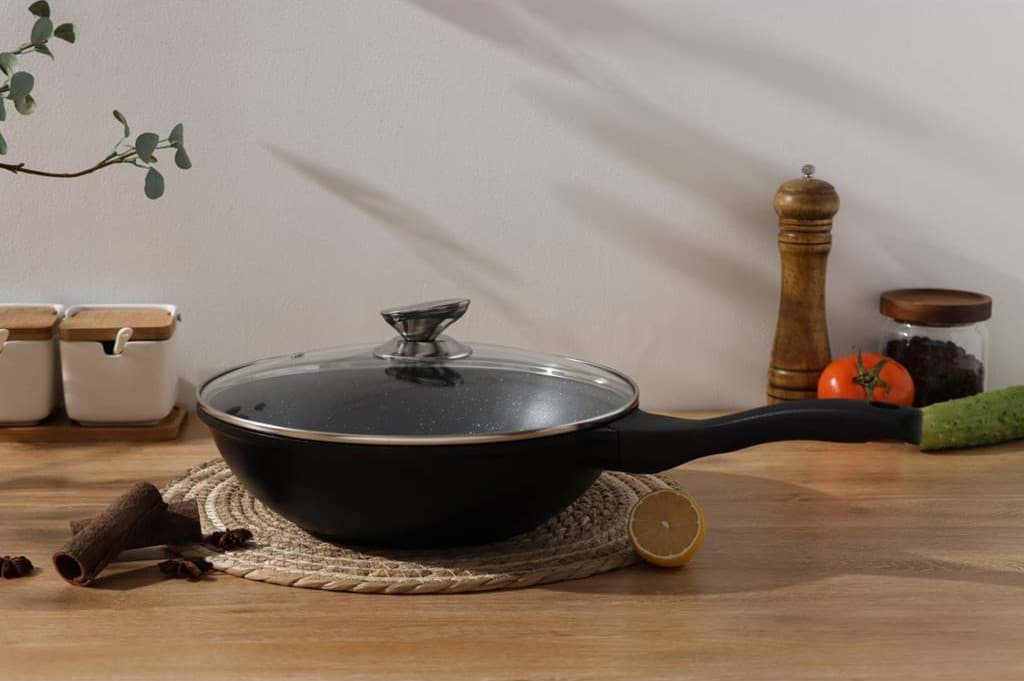 Tigaia Wok Royalty Line, model BW-ML, este proiectată pentru a oferi o experiență culinară superioară, punând accent pe gătitul sănătos și ușor. Învelișul său antiaderent tip marmură asigură că alimentele nu se lipesc, permițând utilizarea unei cantități reduse de ulei sau grăsimi. Această caracteristică nu numai că contribuie la prepararea unor mese mai sănătoase, dar și facilitează curățarea tigăii după utilizare. Designul tip wok, cu margini înalte și fund rotunjit, este ideal pentru a găti rapid și uniform legume, carne și alte ingrediente, menținând aromele și nutrienții esențiali.